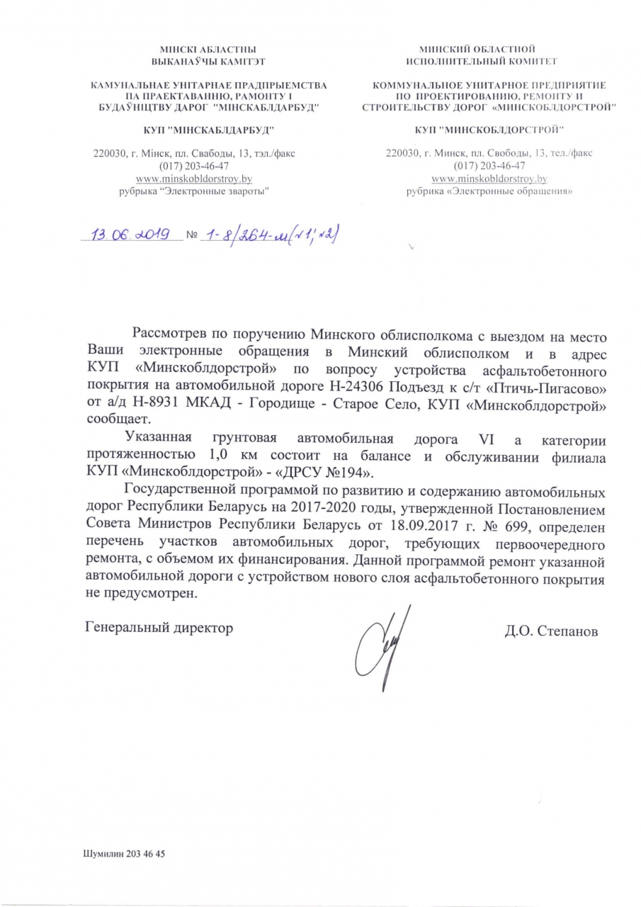 Прошу все же рассмотреть возможность устройства асфальтобетонного покрытия участка дороги (не более 2км) от поворота на кладбище "Западное" в сторону СТ "Птичь 219" Минского района.
