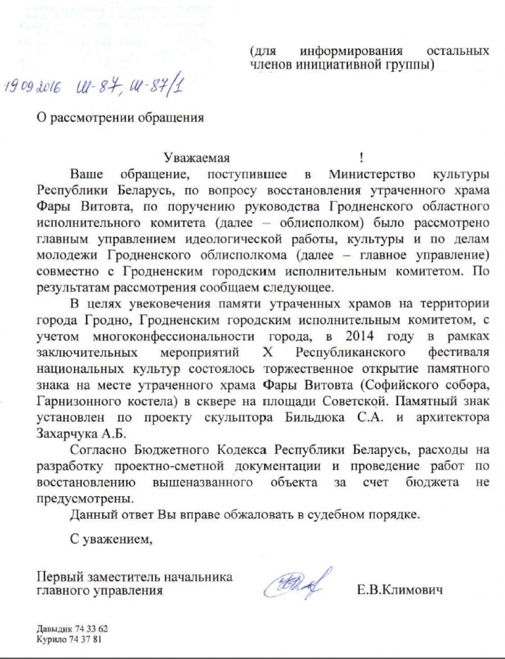Восстановление объекта за счет бюджетных средств не планируется. На месте утраченного храма Фары Витовта установлен памятный знак.