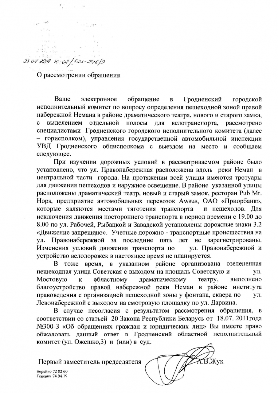 В связи с этим у нас огромная просьба к администрации города сделать вышеописанный район Города свободным от автотранспорта и полностью пешеходным, с выделением отдельной полосы для велотранспорта. Принятие указанных мер, в свою очередь, повлияет на привлекательность данного места среди местных жителей, а также для туристов города.