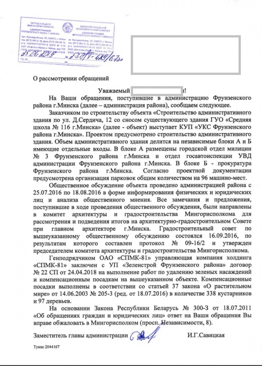 4. Ответ администрации Фрунзенского района нарушает пункт 2 статьи 22 Закона Республики Беларусь «Об обращениях граждан и юридических лиц»: «Коллективные обращения тридцати и более заявителей в организации по вопросам, входящим в их компетенцию, подлежат рассмотрению с выездом на место, если иное не вытекает из этих обращений». Как было указано выше, обращение подписали более 100 человек, однако представители районной администрации не изучили ситуацию на месте и не организовали встречу с жителями квартала по поднятым в обращении вопросам.