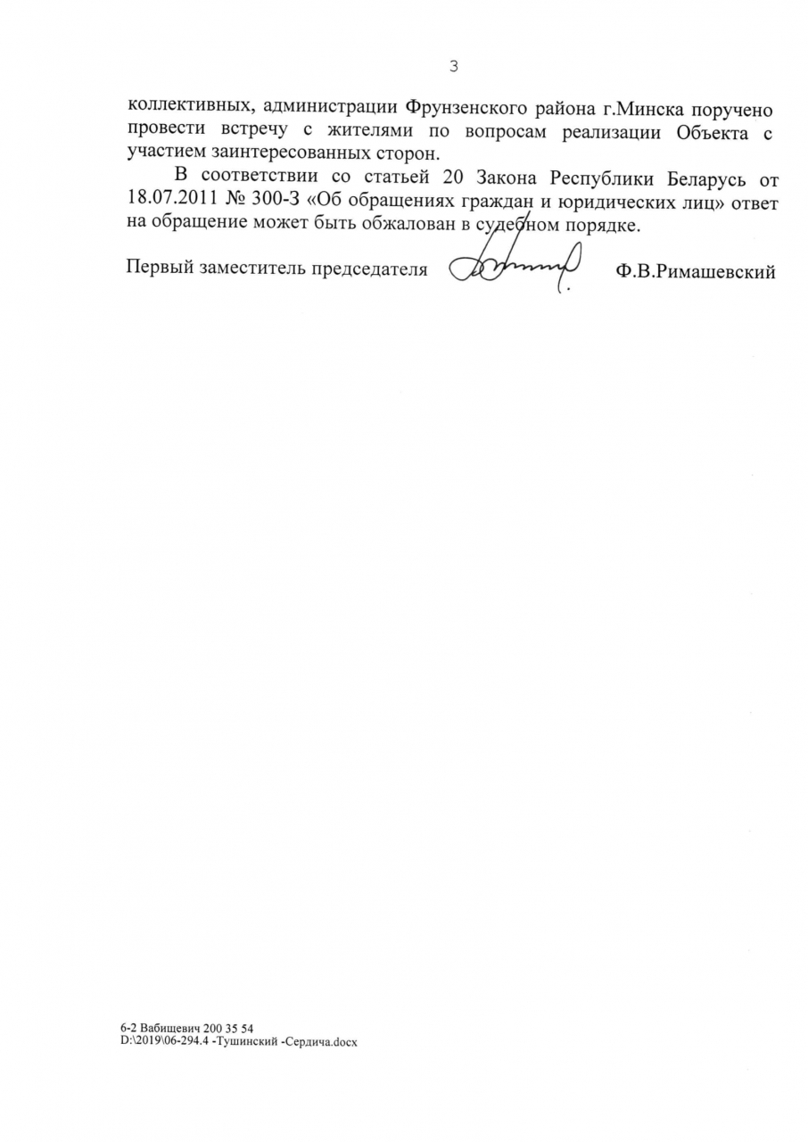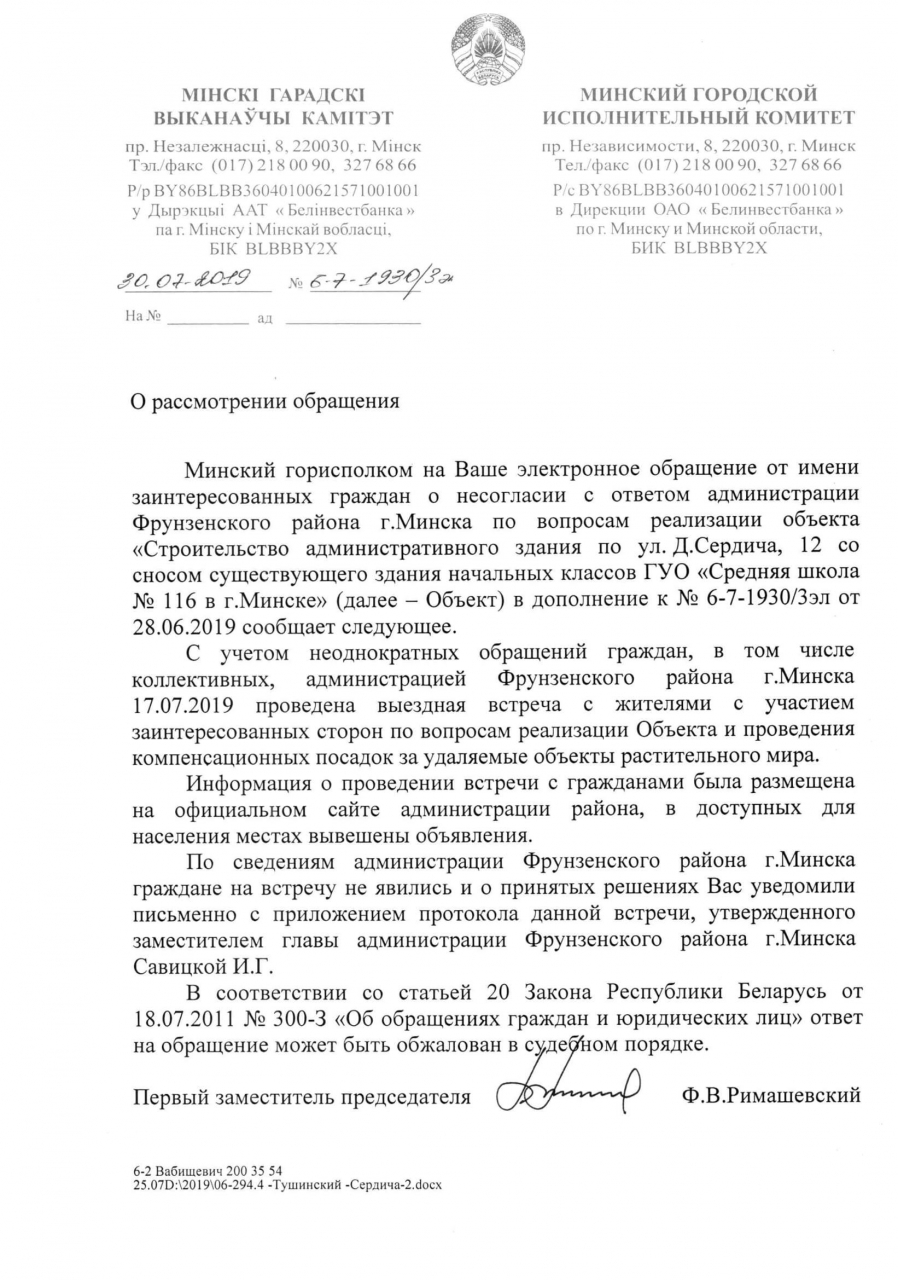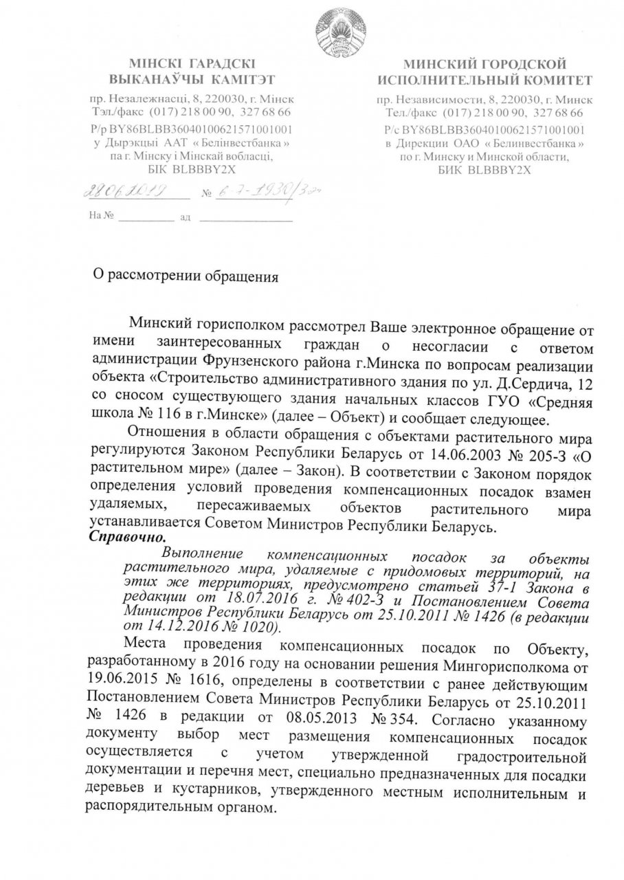 12 апреля 2019 года в адрес администрации Фрунзенского района г. Минска было отправлено коллективное электронное обращение по вопросу озеленения участка по адресу ул. Д. Сердича, 12. Данное обращение подписало более 100 человек. 25 апреля 2019 года получен ответ №2-3-7/Т-489/6,7эл администрации Фрунзенского района на данное обращение.