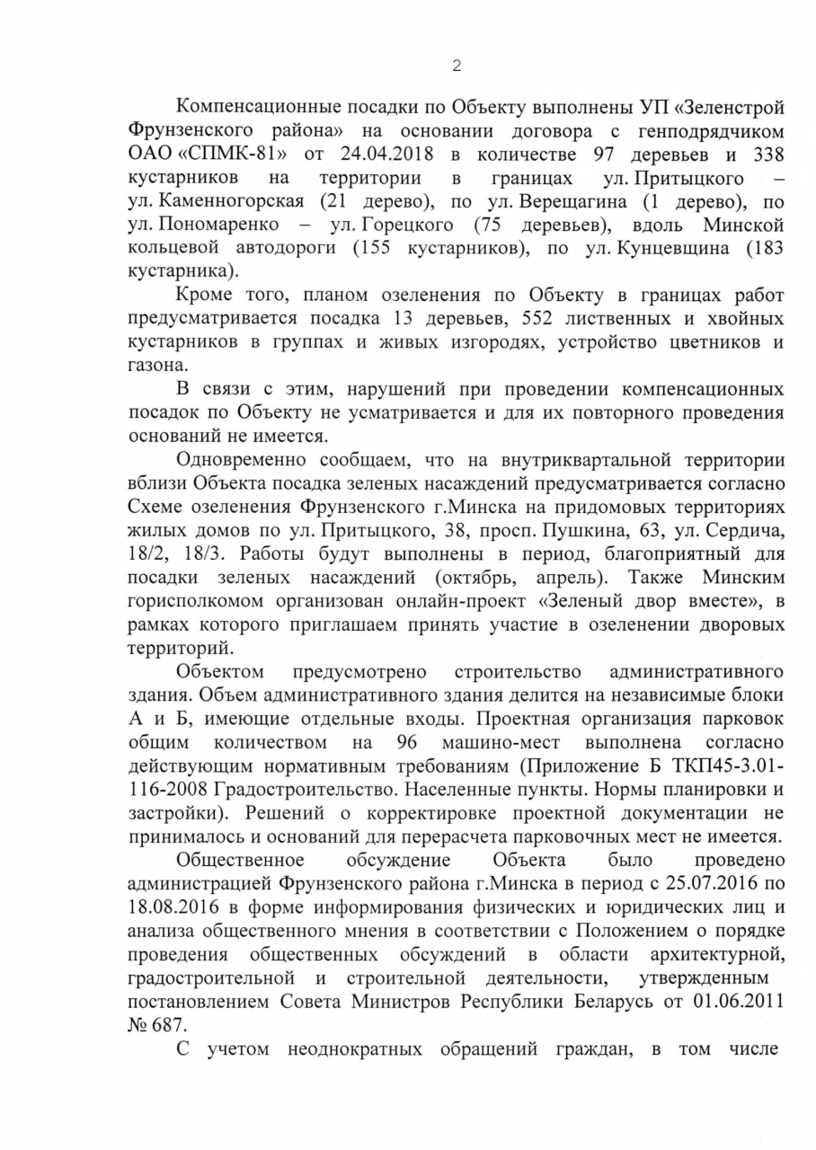 2. В обращении изложено требование произвести компенсационные посадки за объекты растительного мира, удалённые с участка, который входил в расчет нормативной обеспеченности населения придомовыми озелененными территориями, на этом участке либо в непосредственной близости от него на основании статьи 37-1 «Закона о растительном мире Республики Беларусь»: «В случаях удаления деревьев, кустарников, произрастающих на придомовых территориях многоквартирных жилых домов, компенсационные посадки осуществляются на этих же территориях…».