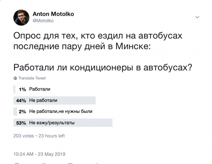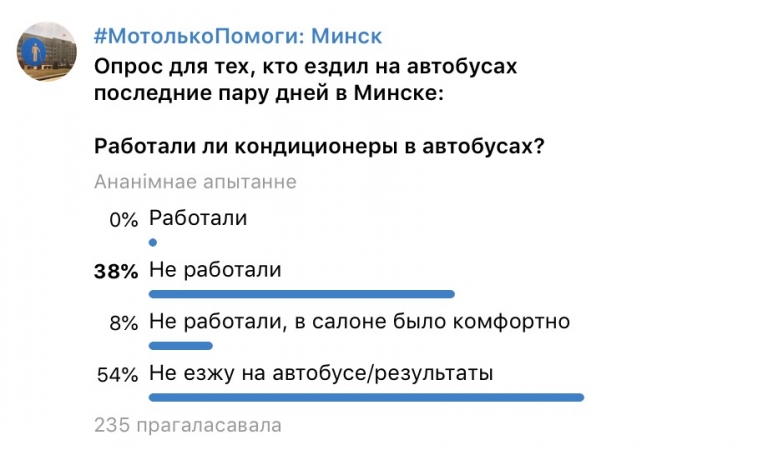 По опросам в соц.сетях твиттер и телеграм(скриншоты прилагаются) - минчане практически не встречали общественный транспорт с работающими кондиционерами, более того, в комментариях отмечали, что на некоторых автобусах работала "печка" и температура в салоне была некомфортной для пассажиров.