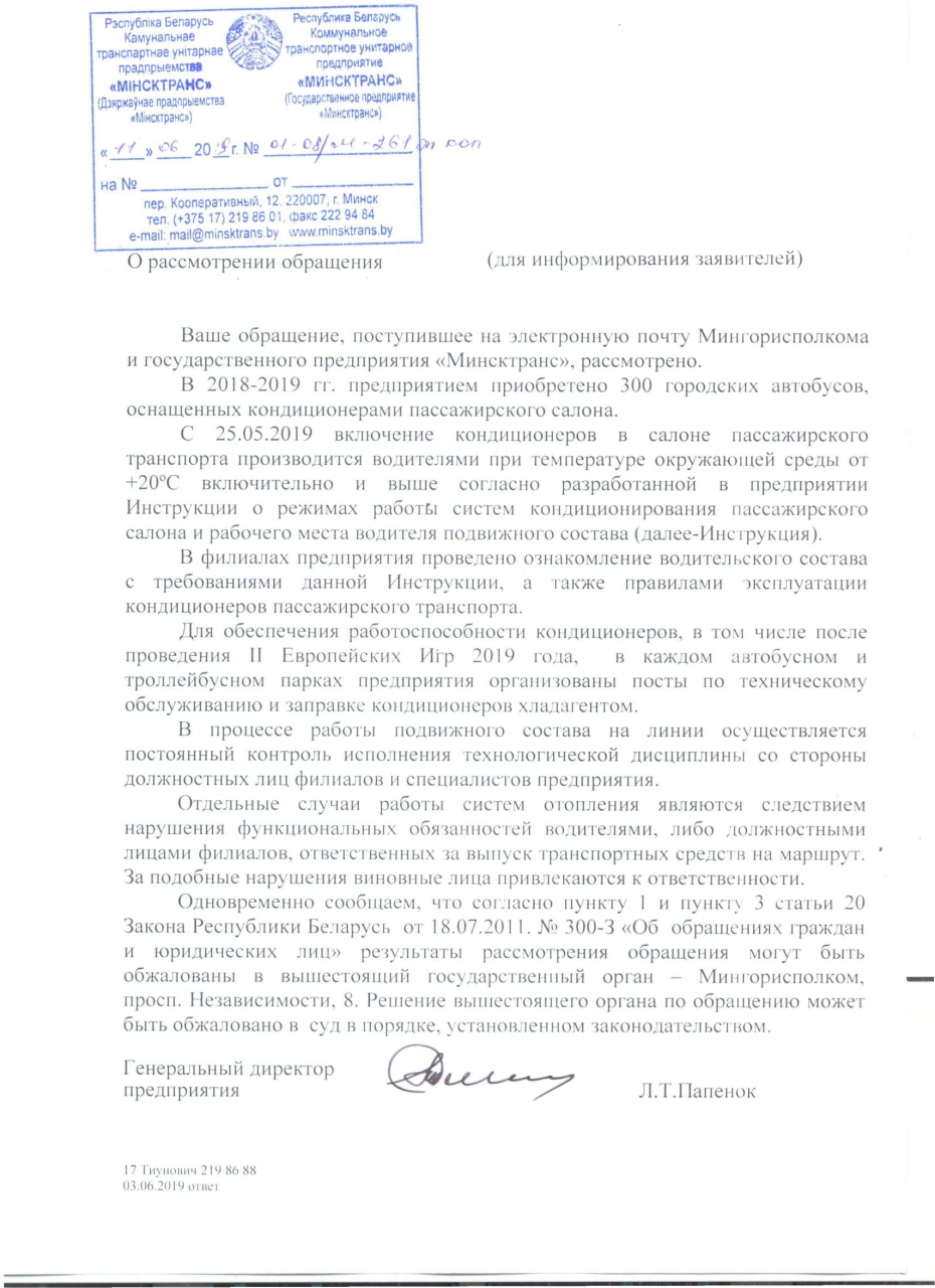 Мы, подписавшие данное обращение требуем провести инструктаж со всеми автопарками Минска и обеспечить комфортную температуру в салонах общественного транспорта в Минске(и работу кондиционеров) в ближайшее время. А также чтобы кондиционеры работали при необходимости и после проведения Европейских игр.