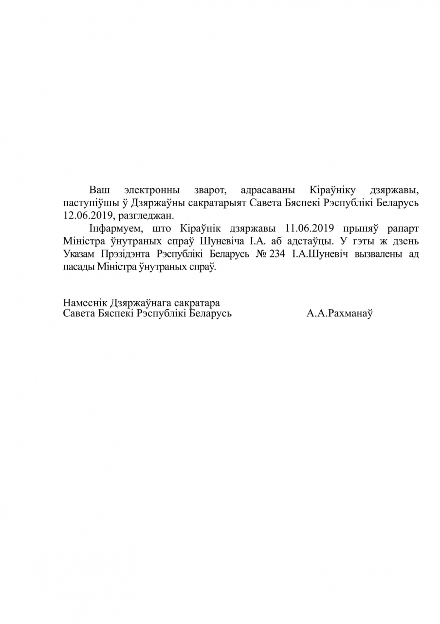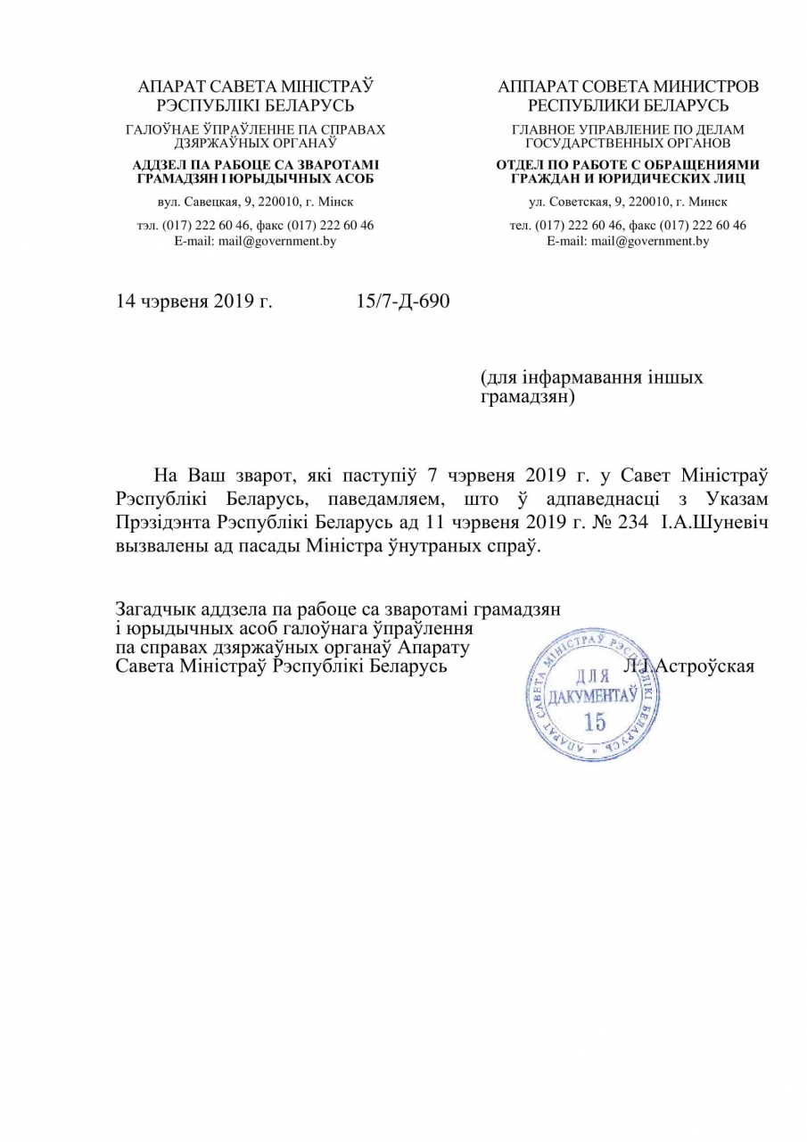 У адпаведнасці з Указам Прэзідэнта Рэспублікі Беларусь ад 11 чэрвеня 2019 г. № 234 І.А.Шуневiч вызвалены ад пасады Міністра ўнутраных спраў