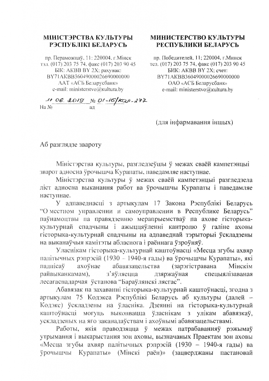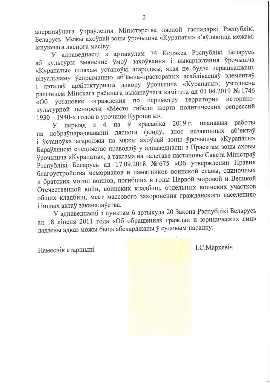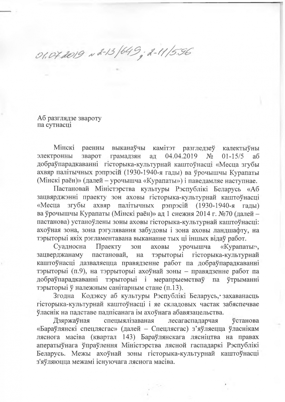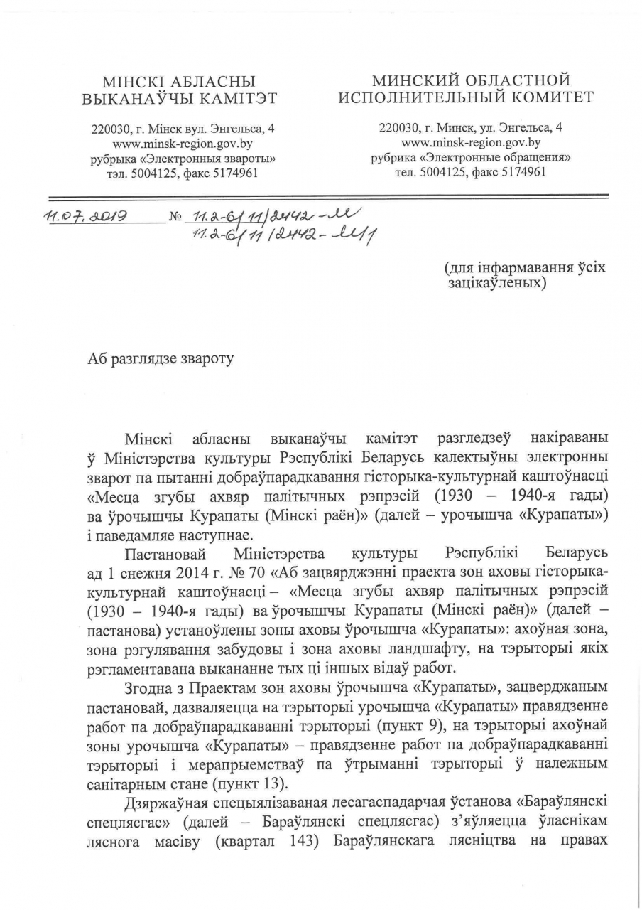 Змяненне ўмоў захоўвання i выкарастання ўрочышча "Курапаты" шляхам устаноўкi агароджы узгоднена рашэннем Мiнскага райвыканкама ад 01.04.2019 №1746. 3 4 па 9 красавiка планавыя работы по добраўпарадкаваннi ляснога фонду, знос незаконных аб`ектаў i ўстаноўка агароджы Бараўлянскi спецлясгас праводзiў у адпаведнасцi з Праектам зоны аховы ўрочышча "Курапаты" i Пастановы Савмiна ад 17.09.2018 №675.