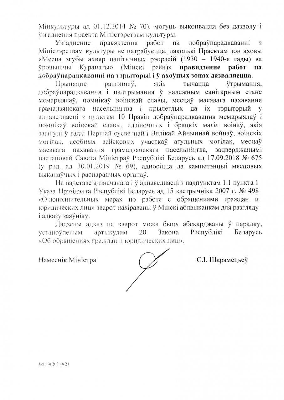 Узгадненне правядзення работ па добраўпарадкаваннi з Мiнiстэрствам культуры не патрабуецца, паколькi правядзенне работ па добраўпарадкаваннi на тэрыторыi i ў ахоўных зонах дазваляецца. Зварот накiраваны ў Мiнскi абылвыканкам для разгляду i адказу заяўнiку.