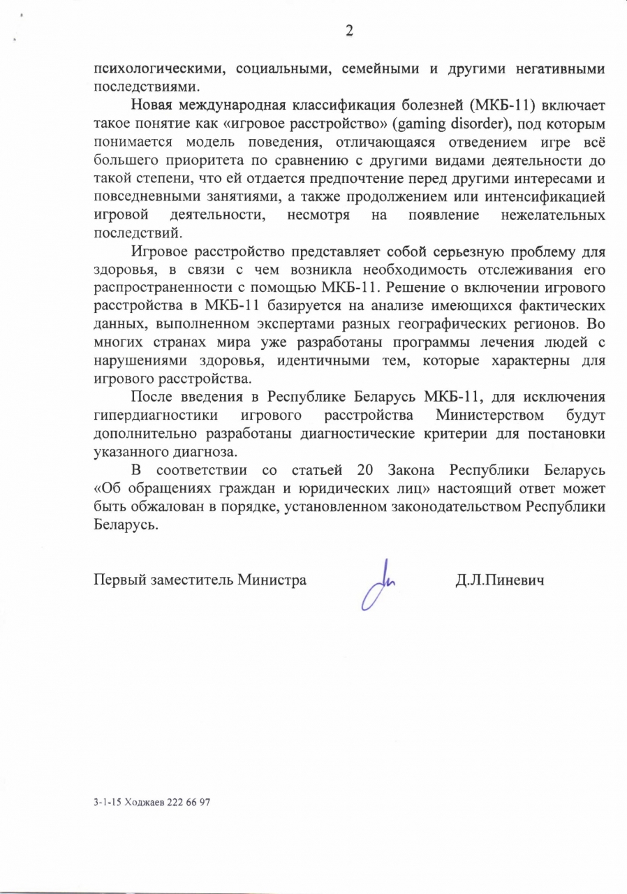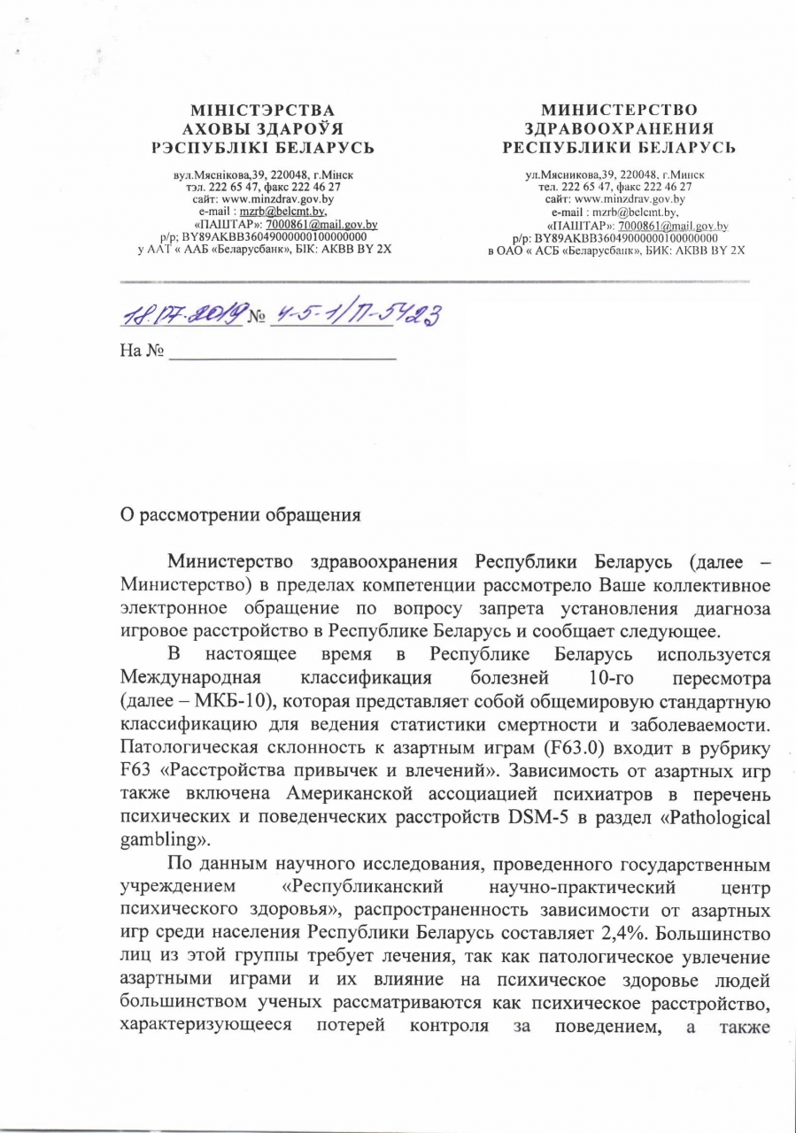 На основании Положения о Министерстве здравоохранения Республики Беларусь, утвержденного Постановлением Совета Министров Республики Беларусь от 28.10.2011 N 1446 , которым установлено, что одной из основных задач Минздрава является проведение единой государственной политики в области здравоохранения, предлагаем не признавать игроманию болезнью и законодательно запретить ставить этот "диагноз". Подобное недопущение необходимо так как, во-первых, нет научных обоснований негативного влияния игр. И если проанализировать утверждения о негативном влиянии игр, то можно увидеть логические ошибки и предвзятость в суждениях, приводящих к выводу о вреде игр.