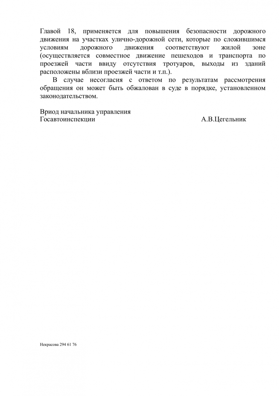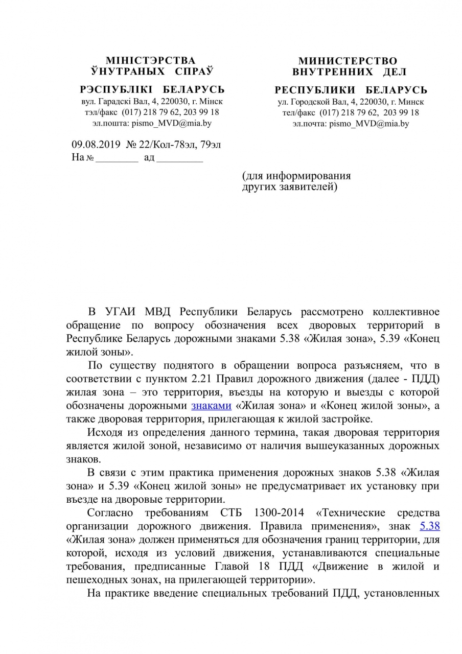 На основании Положения о Министерстве внутренних дел Республики Беларусь, утвержденного Указом Президента Республики Беларусь от 04.12.2007 N 611, которое устанавливает, что МВД в пределах своей компетенции и в соответствии с законодательством организует и осуществляет контроль за соблюдением законодательства в области дорожного движения и обеспечения его безопасности, регулированием дорожного движения; обобщает практику применения законов и иных нормативных правовых актов, разрабатывает предложения по их совершенствованию, для обеспечения выполнения водителями транспортных средств ПДД, а также для обеспечения безопасности детей, стариков в жилых зонах/дворовых территориях просим осуществить установку дорожного знака 5.38. "Жилая зона" и знака 5.39. "Конец жилой зоны" на въездах во всех дворах Республики Беларусь.
