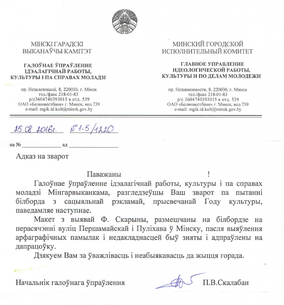 З адкрытых кріныц нам стала вядома про тое, што на скрыжаванні вуліц Першамайскай і Пуліхава ў Мінску з'явіўся білборд з сацыяльнай рэкламай, прысвечанай году культуры. На білбордзе паведамляецца: "Помнік Францыску Скарыне, асветніку і грамадскому дзеячу XV стагоддзя ў Мінску" (спасылка http://euroradio.fm/na-bilbordze-pablytali-stagoddze-u-yakim-drukavau-svae-knigi-skaryna-fota )