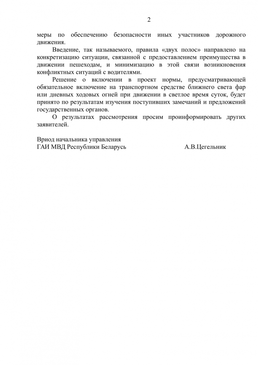 Не менее бесполезно, по нашему мнению, и введение, так называемого, «правила двух полос», согласно которому конкретизируется ситуация, когда водителем правомерно будет обеспечено преимущество в движении пешеходу. Предлагается определить, что преимущество пешеходу считается предоставленным, если расстояние между транспортным средством и пешеходом в точке предполагаемого пересечения их траекторий движения составило не менее двух полос движения (одну полосу и трамвайные пути, одну полосу и разделительную полосу или зону). Вызвано оно вероятно распространённой неосведомлённостью инспекторов, которые не в курсе, что согласно действующим Правилам водитель обязан " уступить дорогу пешеходам». Уступить дорогу это значит «не возобновлять движение, снизить скорость движения вплоть до остановки транспортного средства или не осуществлять какой-либо маневр (за исключением требования освободить занимаемую полосу движения, подаваемого регулировщиком или водителем транспортного средства оперативного назначения), если это может вынудить другого участника (других участников) дорожного движения изменить направление и (или) скорость движения» Всё просто и понятно всем, кроме инспекторов, запрещающих движение автомобиля в случае нахождения пешехода на проезжей части вообще! Каким образом руководство ГАИ предлагает фиксировать расстояние между пешеходом и транспортным средством?