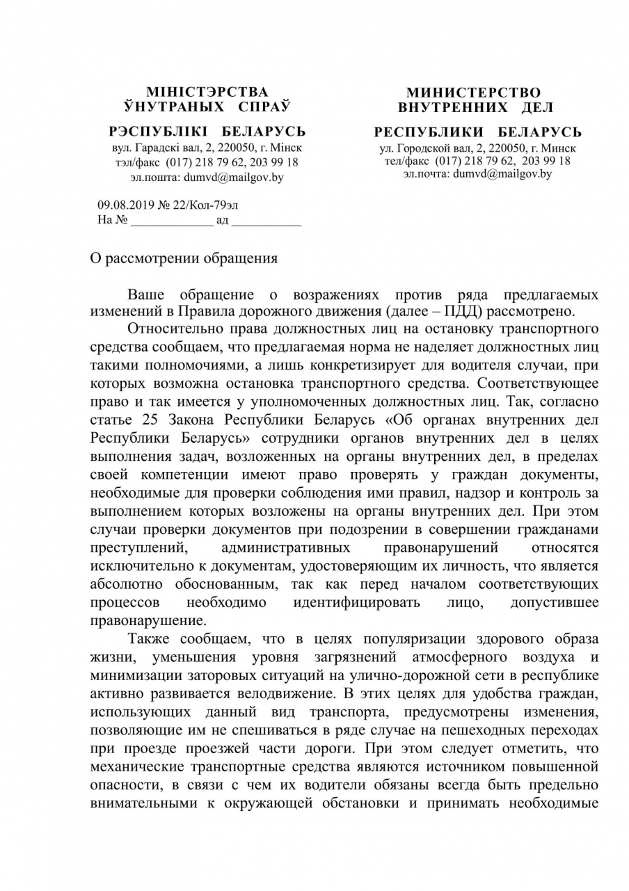 В первую очередь мы резко протестуем против предлагаемого нововведения, «предоставляющего право остановить транспортное средство просто для проверки документов". Во всём мире проверка документов практикуется при подозрении проверяемого в правонарушении. Неслучайно в знаменитой статье 25 Закона «Об органах внутренних дел Республики Беларусь» законодатель достаточно чётко определил: «Сотрудники органов внутренних дел в целях выполнения задач, возложенных на органы внутренних дел, в пределах своей компетенции имеют право: проверять у граждан при подозрении в совершении ими преступлений, административных правонарушений документы, удостоверяющие их личность, а также документы, необходимые для проверки соблюдения ими правил, надзор и контроль за выполнением которых возложены на органы внутренних дел».