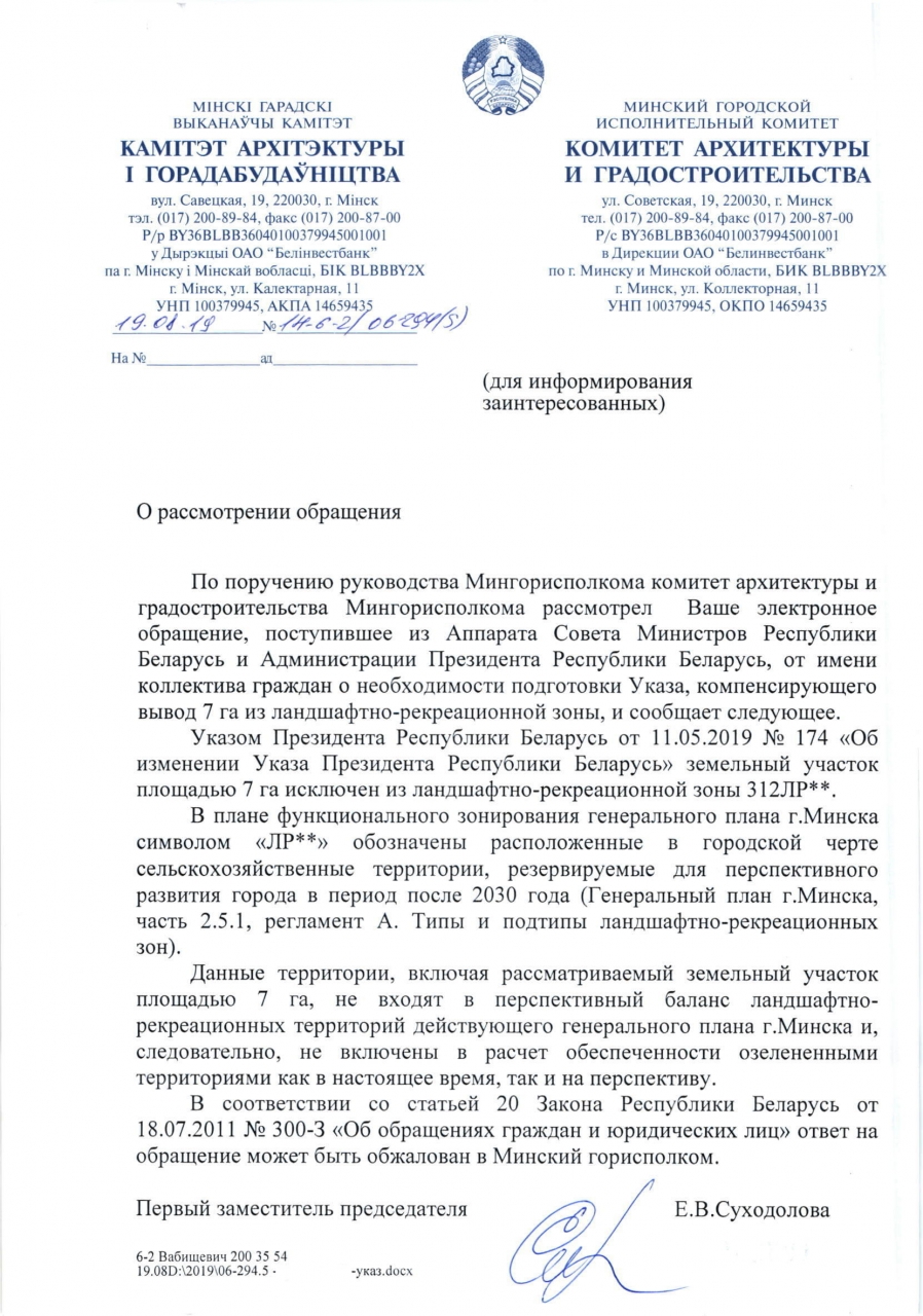Указ Президента Республики Беларусь от 11 мая 2019 года №174 «Об изменении Указа Президента Республики Беларусь» постановляет внести изменение в Генеральный план города Минска, а именно: исключить из ландшафтно-рекреационной зоны ЛР312 земельный участок площадью 7 га. и включить его в зону пространственно смешанной жилой застройки многоквартирного и усадебного типа Жсп 29.