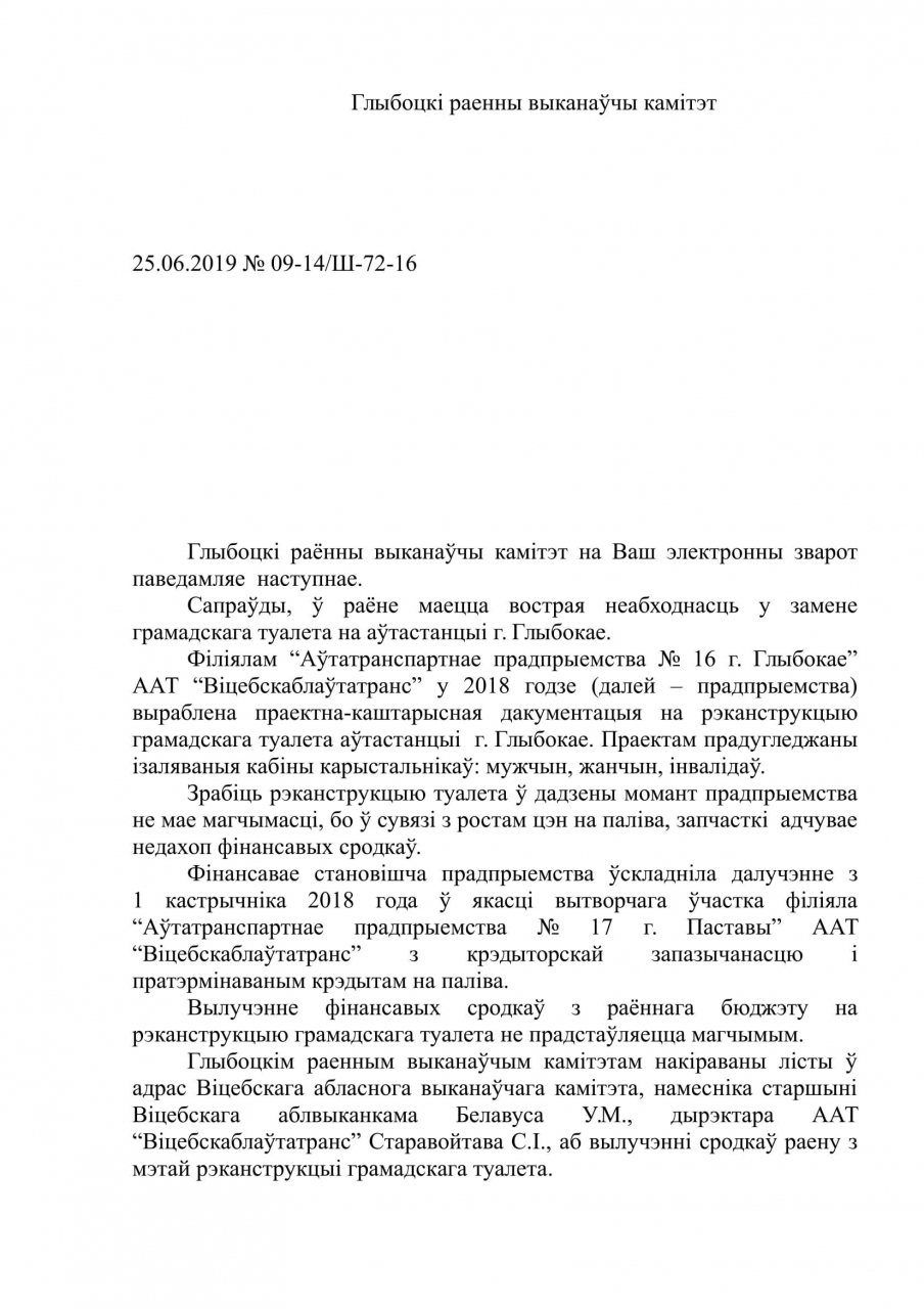 У сувязі з вышэйнапісаным, просім знайсці грашовыя сродкі і абсталяваць на аўтастанцыі г. Глыбокае туалет з каналізацыяй і вадаправодам. Просім разгледзець дадзены зварот і даслаць адказ у тэрмін, вызначаны заканадаўствам.