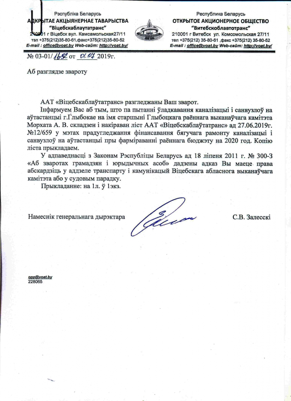 Па пытанню ўладкавання каналiзацыi i санвузлоў на аўтастанцыi г.Глыбокае на iмя старшынi Глыбоцкага райвыканкама накiраваны лicт у мэтах прадугледжання фiнансавання бягучага рамонту пры фармiраваннi раённага бюджэту на 2020 г.