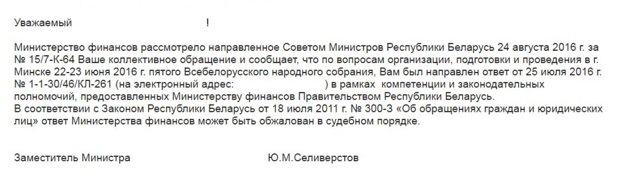Письмо Министерства финансов от 25.07.2016 № 1-1-30/46/КЛ-261 не содержит ответа НИ НА ОДИН из поставленных в обращении вопросов. Более того, из него не усматривается даже попытки рассмотреть обращение по существу: в ответе приведено описание пятого Всебелорусского народного собрания как общественно-политического мероприятия, освещен порядок избрания делегатов и источник финансирования. Однако вся эта информация является общедоступной, содержится в нормативных актах и без того была известна заявителям.