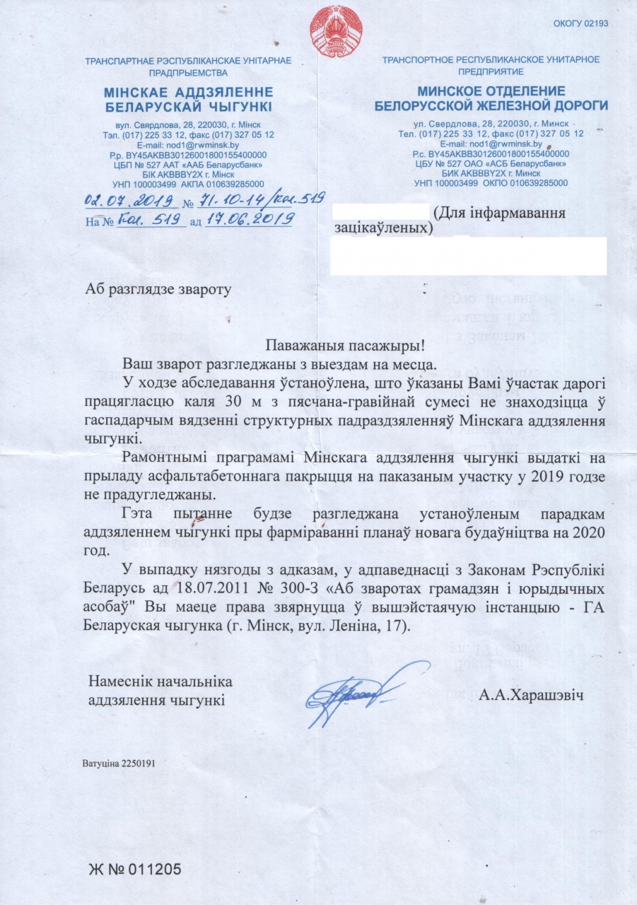 Пытаннае аб выдатках на прыладу асфальтабетоннага пакрыцця на паказаным участку будзе разгледжана ўстаноўленым парадкам адзяленнем чыгункi пры фармiраваннi планаў новага будаўнiцтва на 2020 г.