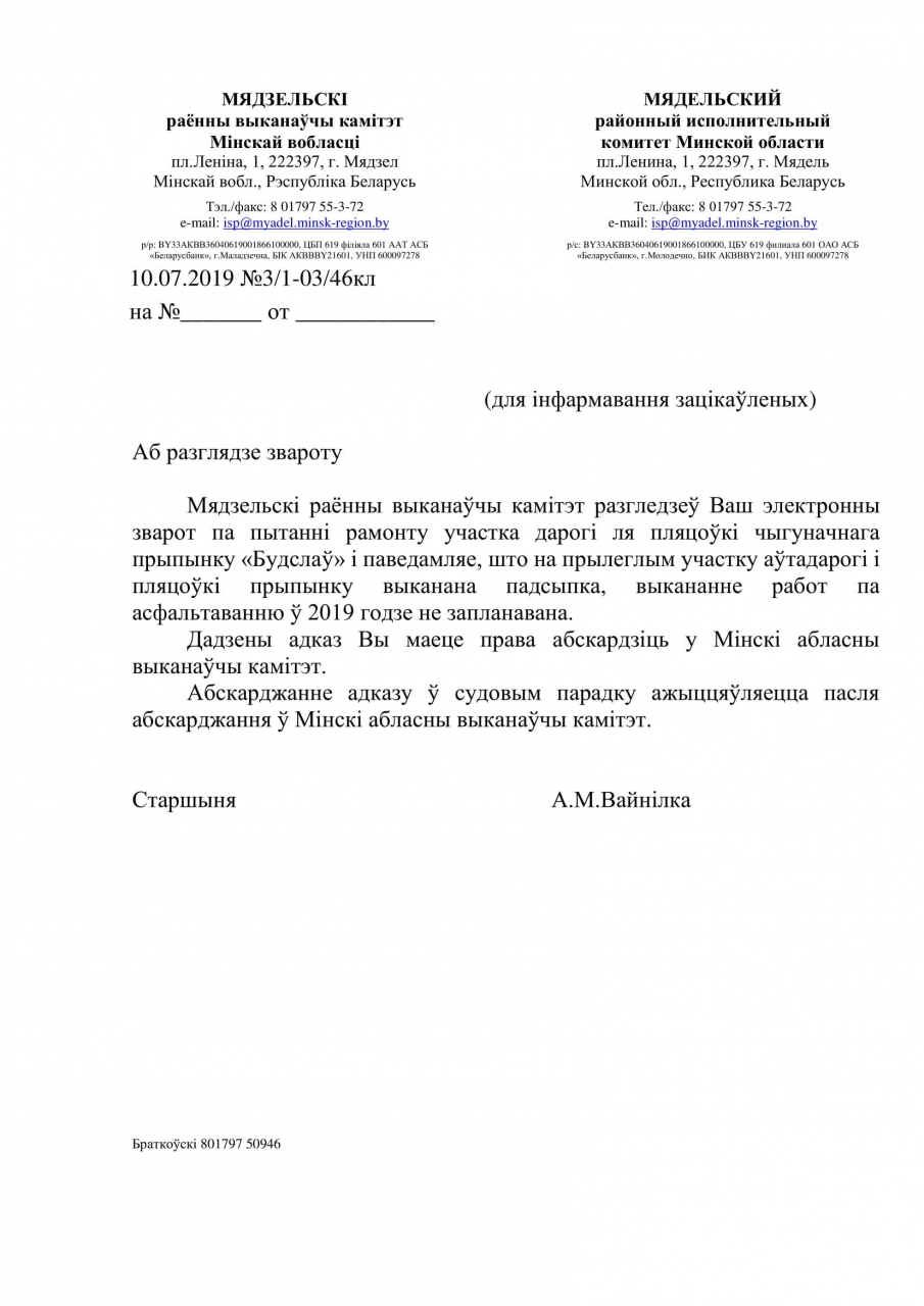 Мы просім заасфальтаваць дадзены адрэзак дарожнага палатна. Улічваючы тое, што дадзеныя работы не патрабуюць вялікага аб’ёму працы і значных фінансавых укладанняў, спадзяёмся на станоўчае вырашэнне дадзенага пытання.
