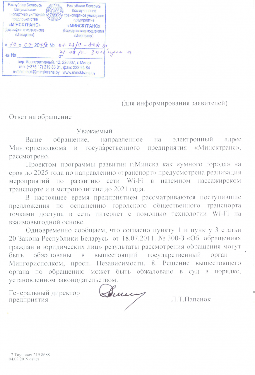 На основании ст. 41 Закона «О местном управлении и самоуправлении», которая устанавливает, что исполкомы создают условия для обеспечения граждан услугами связи, просим обеспечить публичный бесплатный доступ к Wi-Fi в общественном транспорте в городе Минске.
