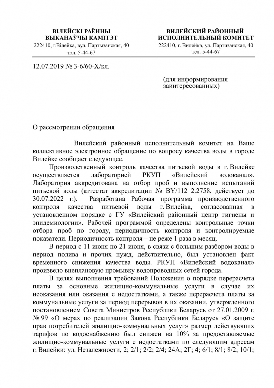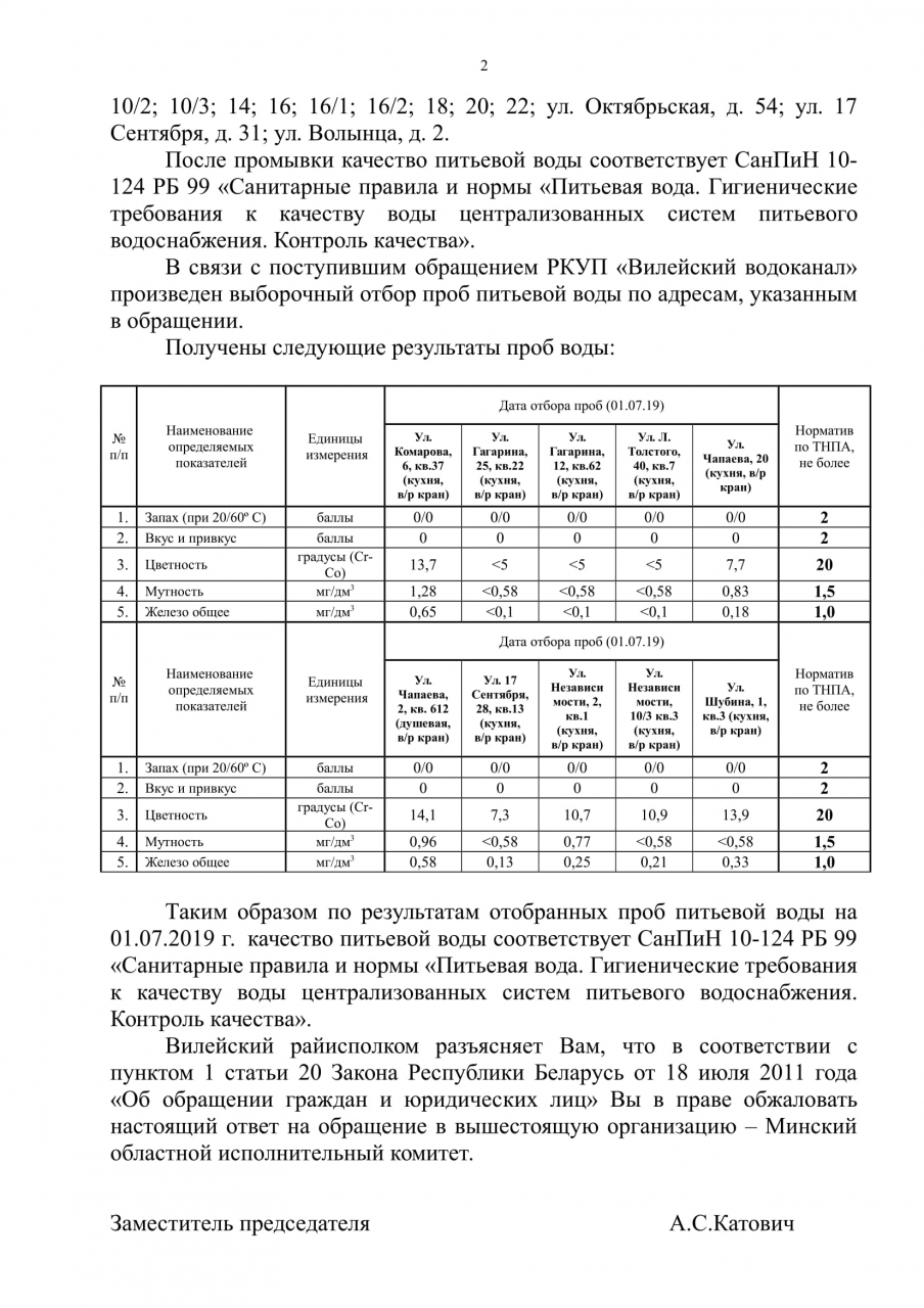 По результатам отобранных проб питьевой воды на 01.07.2019 качество питьевой воды соответствует СанПиН 10-124 РБ 99 «Санитарные правила и нормы «Питьевая вода. Гигиенические требования к качеству воды централизованных систем питьевого водоснабжения. Контроль качества».