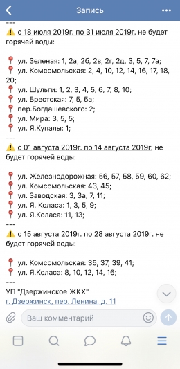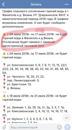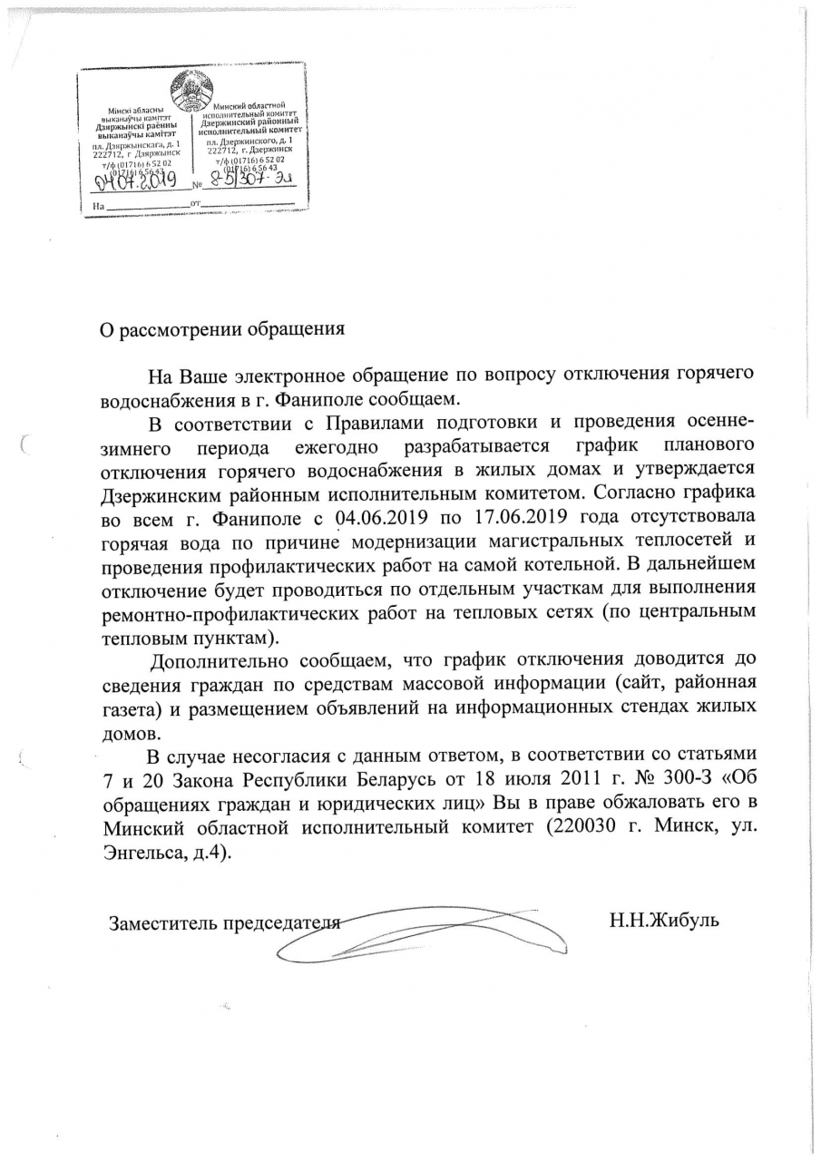 Мы требуем, чтобы в 2019 году в городе Фаниполь летом не проходило сезонное отключение воды. В нашем городе на протяжении уже нескольких лет перебои с горячей водой в квартирах. Например, в 2018 году в холодный период отключили воду на неделю, когда в квартирах температура была уже ниже 10 градусов ночью, но даже тёплой воды в кране не было.