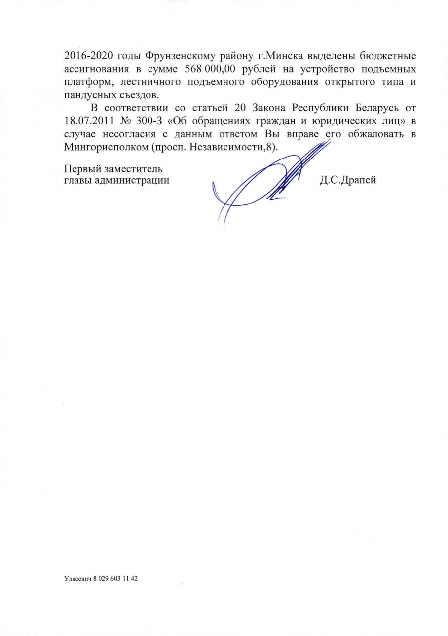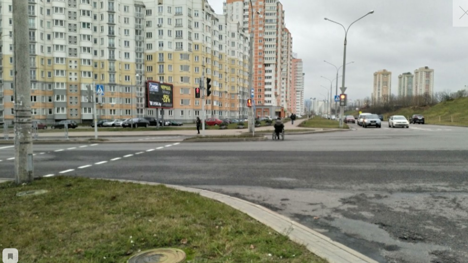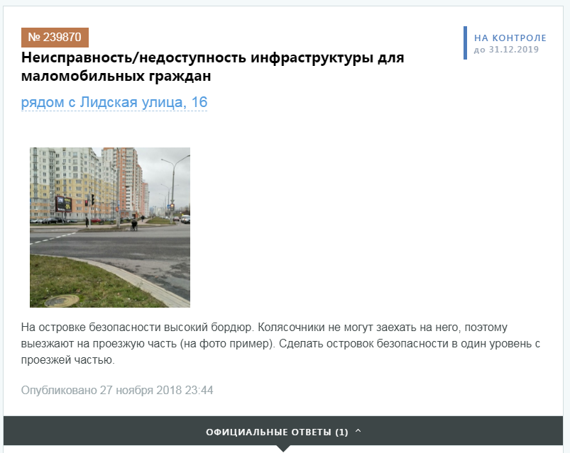 В ноябре первый в списке заявитель настоящего обращения стал свидетелем того, что гражданин на коляске, не сумев заехать на островок безопасности из-за высокого бордюра, поехал его объезжать (видно на фото). Сфотографировав это, сделан запрос в 115.бел с просьбой сделать понижение бордюрного камня, на что получен ответ, что, когда делали этот островок безопасности были другие нормы, а пока островок безопасности на гарантийном обслуживании, ничего делать не будут.