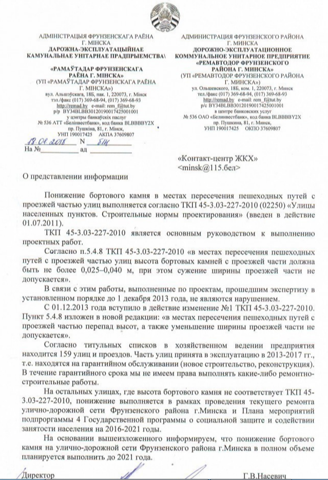 Выходит закон говорит, что перепада быть не должно, но он есть. Люди на инвалидных колясках сейчас испытывают дискомфорт, в то время как для туристов II Европейских игр в центре полным ходом делают такие понижения, для того, чтобы пустить пыль в глаза. И еще из ответа КУП "Ремавтодор Фрунзенского района г.Минска" непонятно, когда эти гарантийные сроки выйдут.