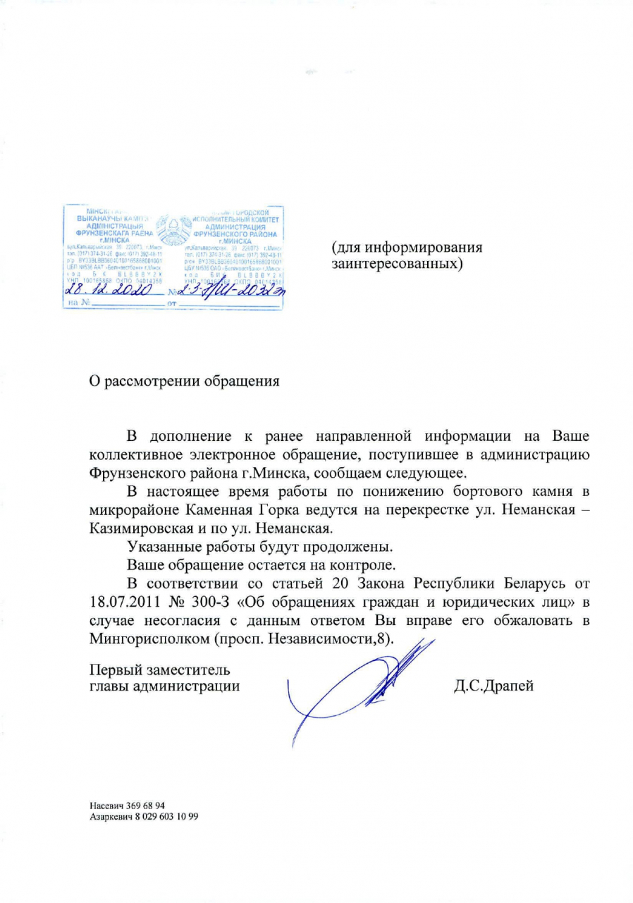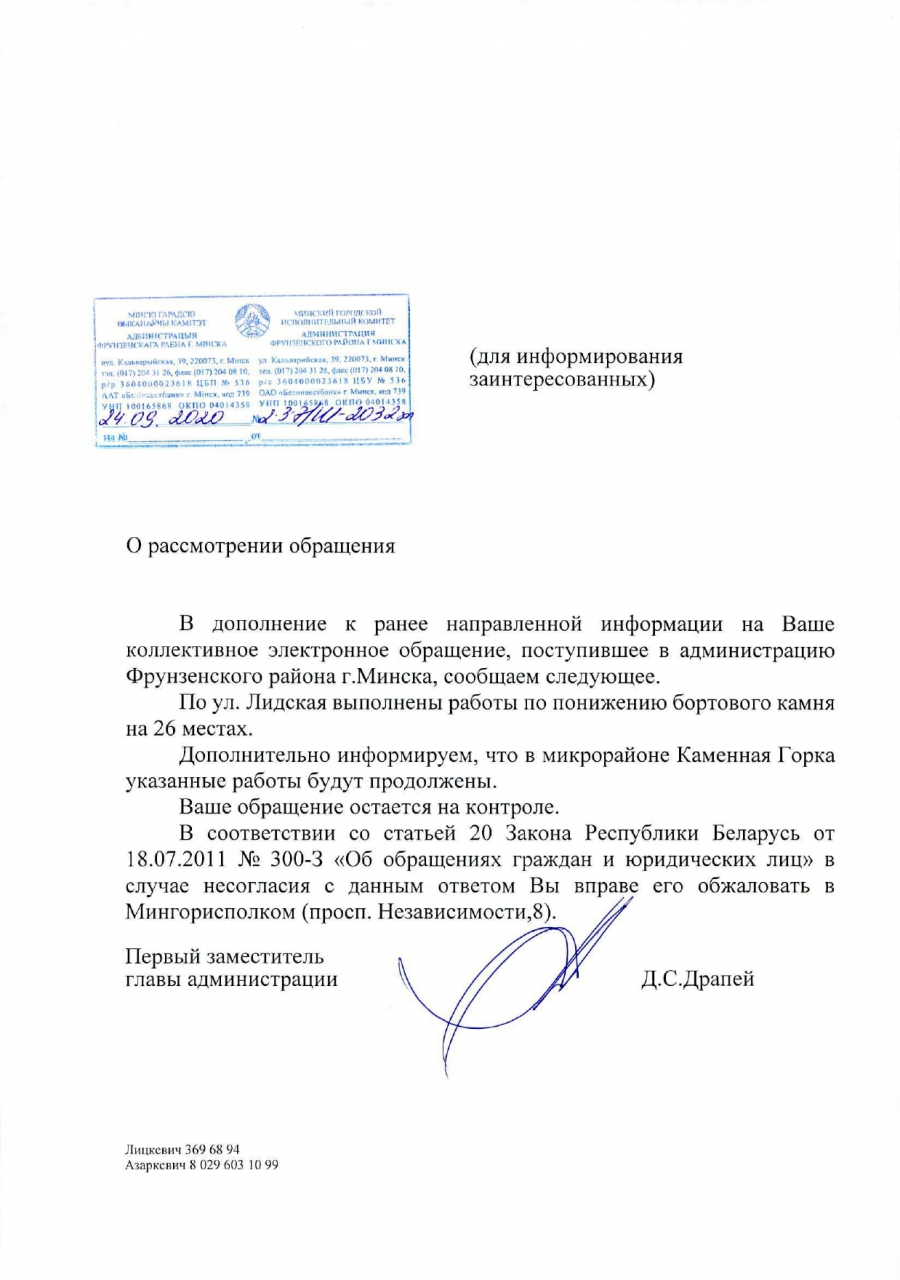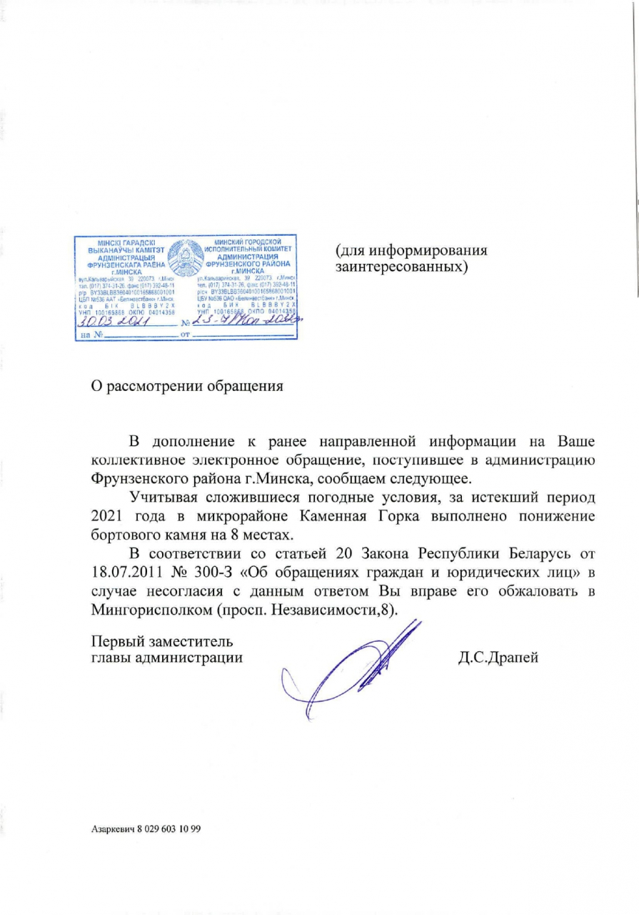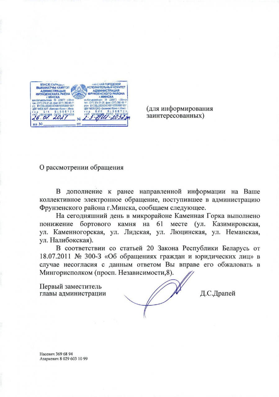 UPD 2. В микрорайоне "Каменная Горка" выполнено понижение бортового камня на 61 месте (ул.Казимировская, ул.Каменногорская, ул.Лидская, ул.Люцинская, ул.Нёманская, ул.Налибокская).