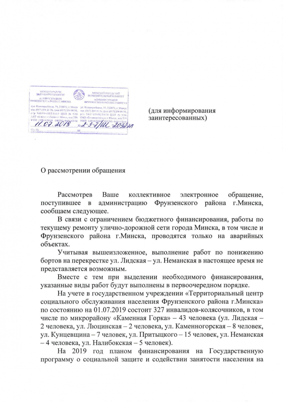 В связи с ограничением бюджетного финансирования выполнение работ по понижению бортов на перекрёстке ул.Лидская-ул.Неманская в настоящее время не представляется возможным, но при выделении финансирования данные работы будут выполнены в первоочередном порядке.