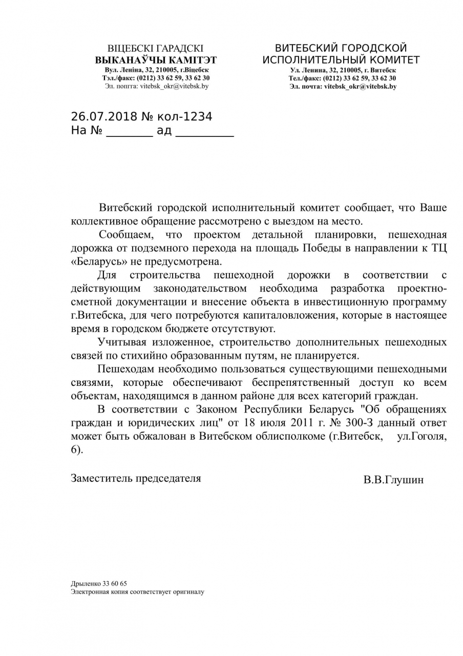 14.06.2019 г. получен ответ (№Кол-968) на коллективное обращение по созданию пешеходной дорожке от подземного перехода к ТЦ "Беларусь". В данном ответе указано, что проектом детальной планировки пешеходная дорожка в данном направлении не предусмотрена.