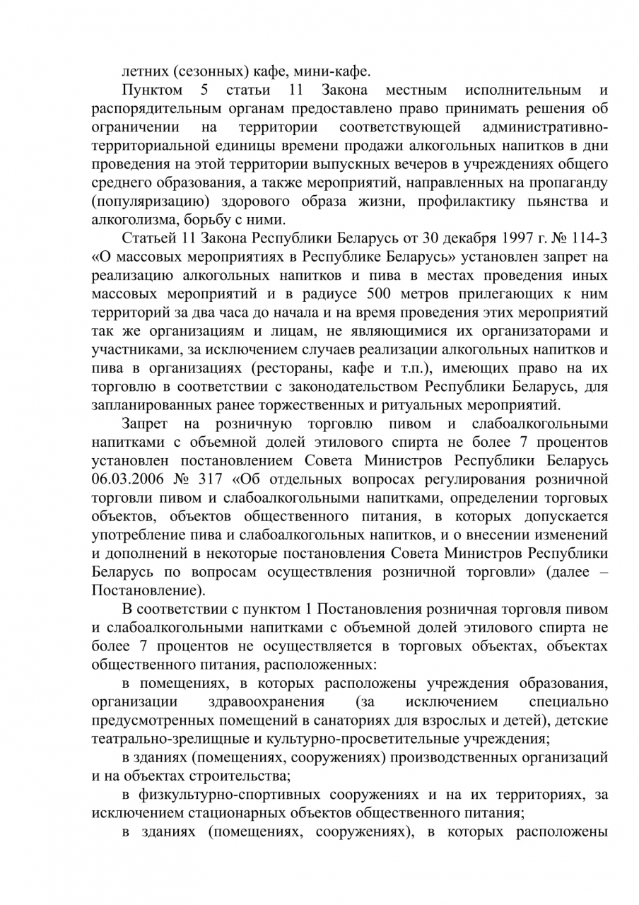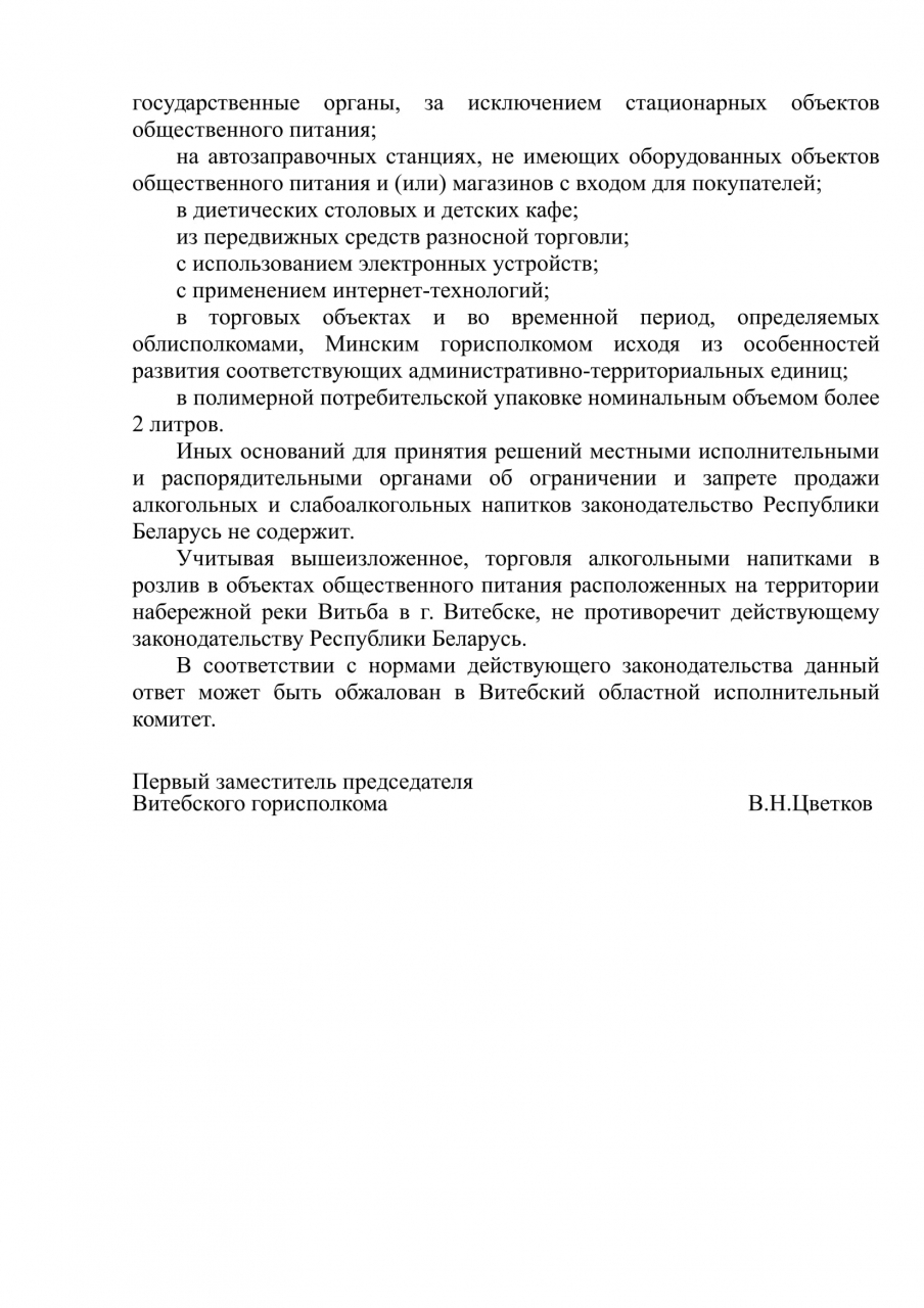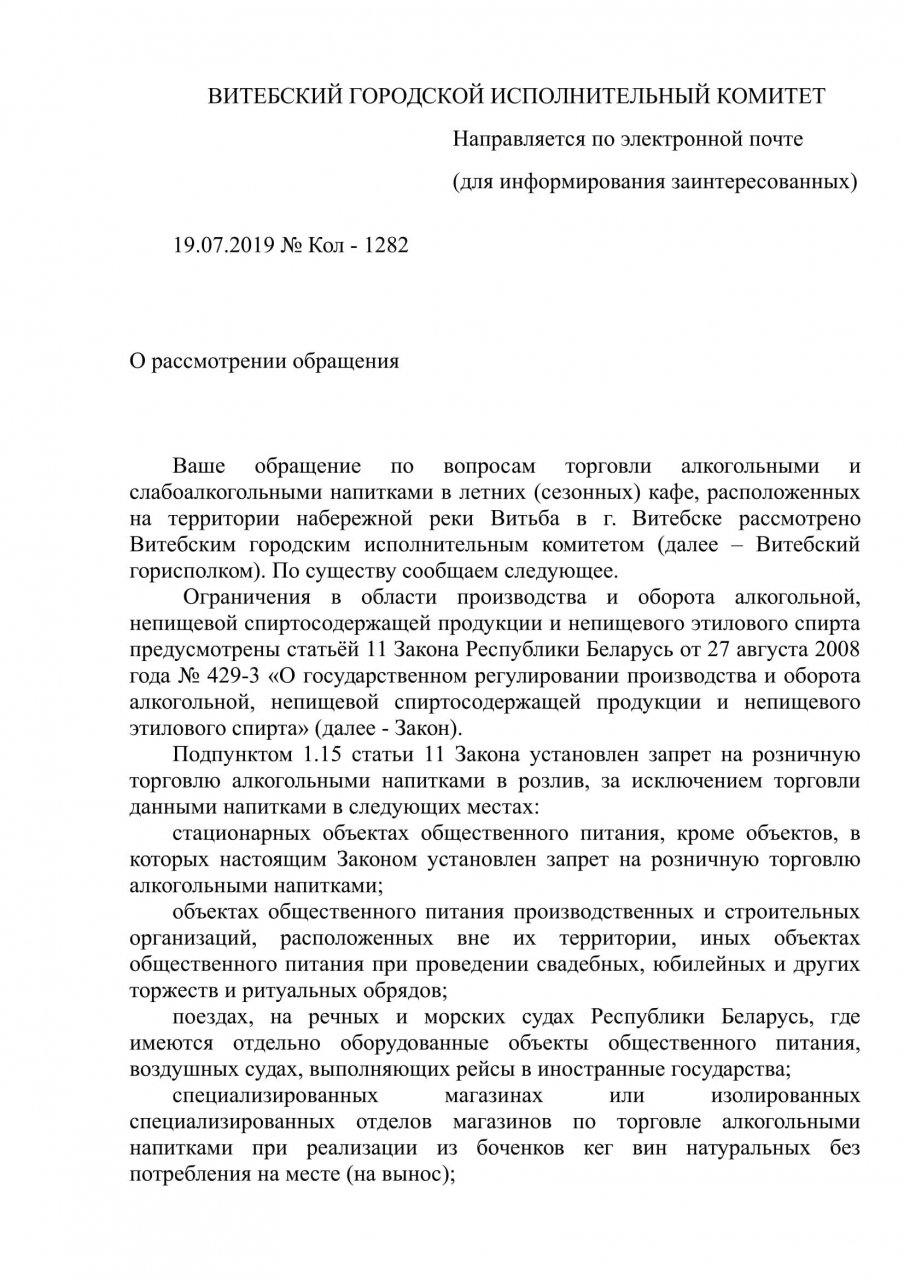 На основании вышеизложенного просим принять меры по запрету торговли и употребления алкогольных и слабоалкогольных напитков, в том числе пива, на территории парка культуры и отдыха имени Фрунзе, расположенного на набережной реки Витьба, а также в парке имени 40-летия ВЛКСМ.