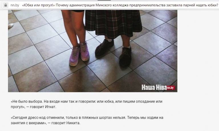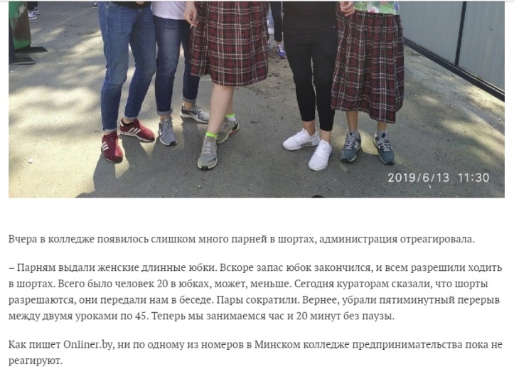 Буквально на днях в Минском колледже предпринимательства произошёл инцидент, когда администрация данного учебного заведения методом давления на учащихся заставила переодеться около 20 учащихся мужского пола в женские юбки.