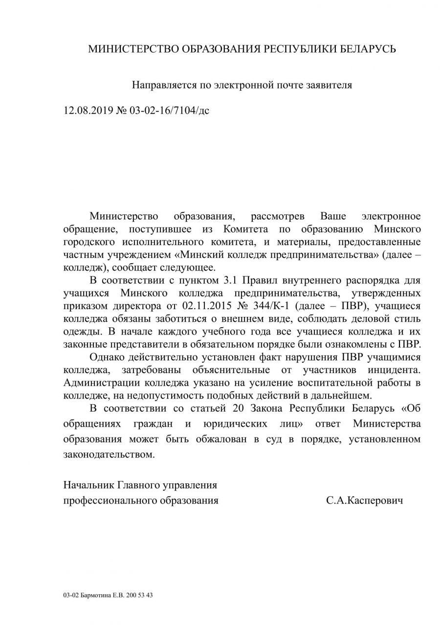1) провести проверку и дать правовую оценку действиям сотрудников ЧУО "Минский колледж предпринимательства" по вышеописанным обстоятельствам, в случае установления факта нарушения законодательства привлечь виновных лиц к ответственности;