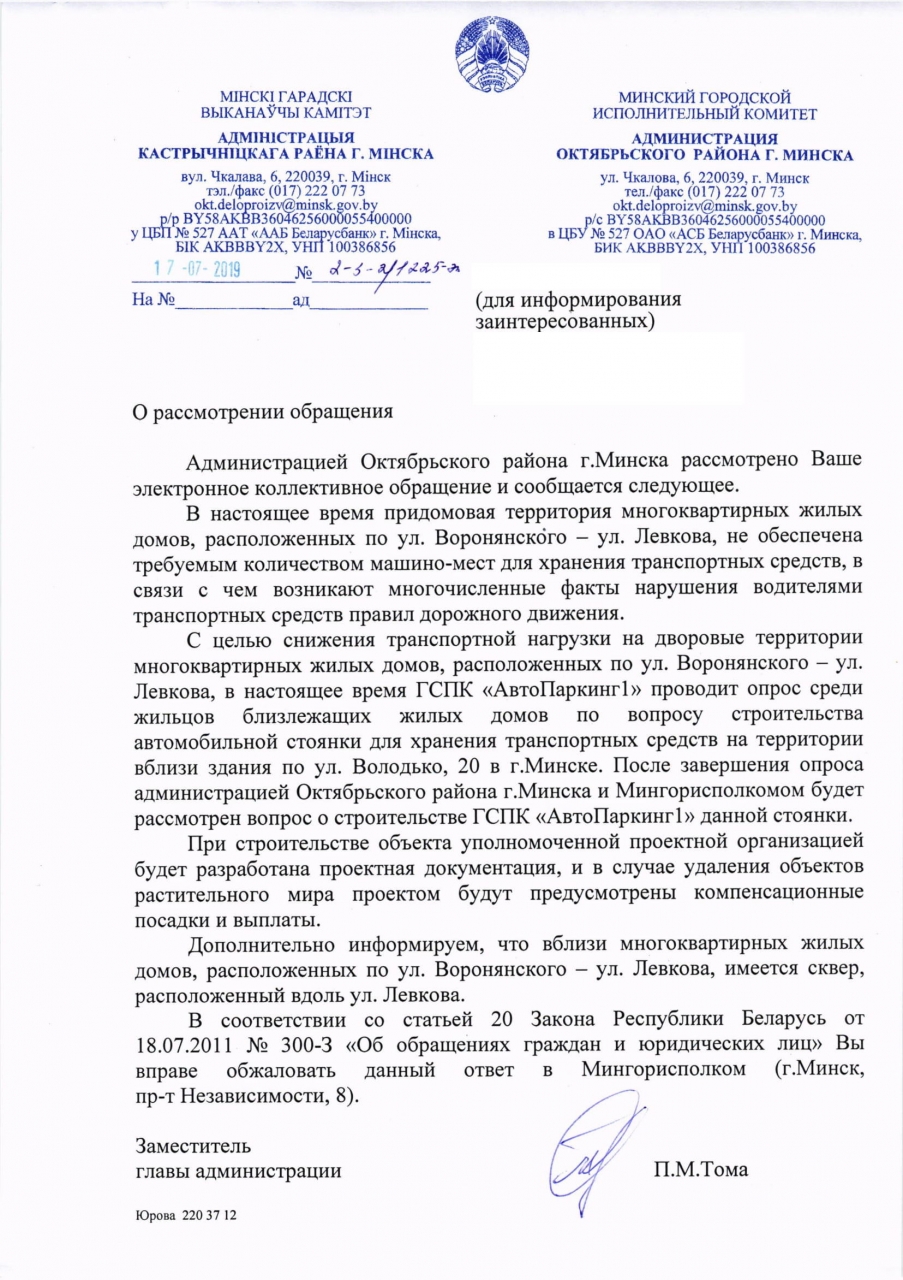 На основании ст. 41 Закона «О местном управлении и самоуправлении», которая устанавливает, что исполкомы решают вопросы размещения объектов строительства на соответствующей территории, просим принять меры по недопущению строительства парковки в районе дома №20 по ул.Володько, а также рассмотреть возможность обустройства в данном районе новой детской площадки.