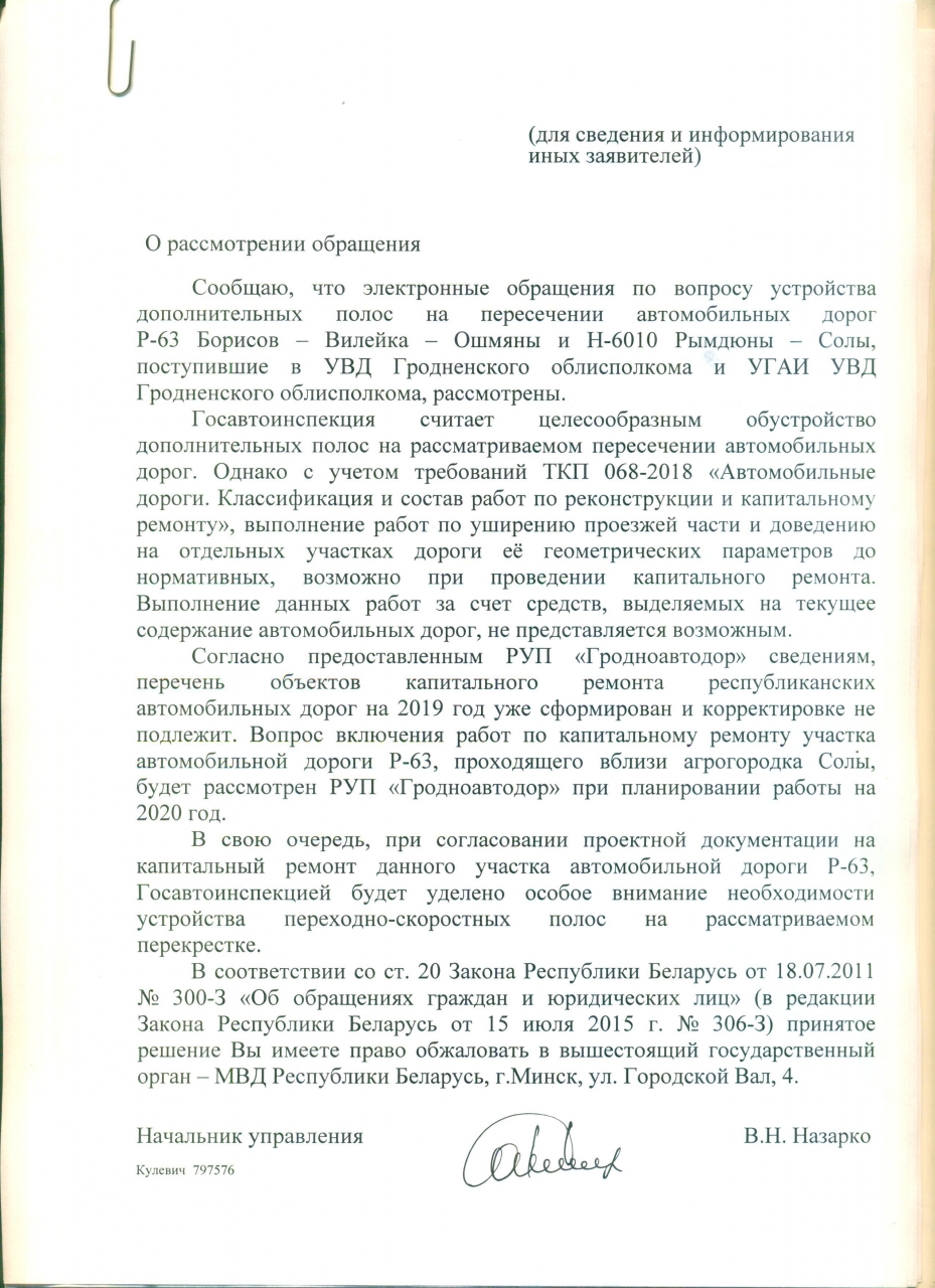 УГАИ ГУВД Гродненского облисполкома считает целесообразным обустройство доп.полос, однако выполнение работ по уширению проезжей части возможно при проведении капитального ремонта. При согласовании проектной документации капитального ремонта данного участка дороги УГАИ ГУВД Гродненского облисполкома будет уделено особое внимание необходимости устройства переходно-скоростных полос на рассматриваемом перекрёстке.