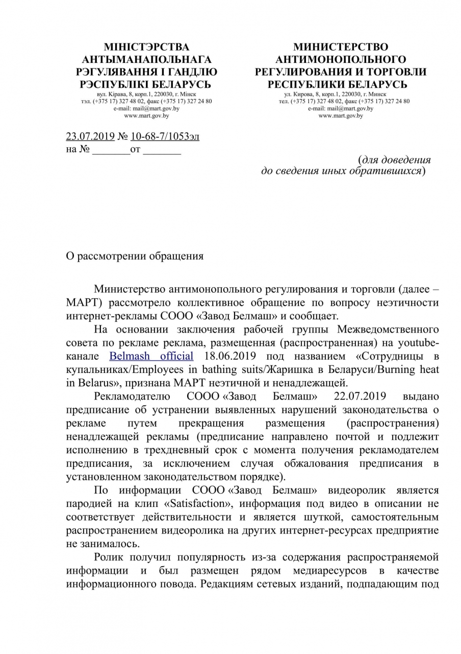 - дать правовую оценку рекламному ролику СООО " Завод Белмаш" на наличие в нём неэтичных, ненадлежащих эпизодов, оскорбляющих женщин, пропаганды пренебрежения правилами техники безопасности при работе с оборудованием, что нарушает п. 8 ст.10 и п.3 ст.26 Закона "О рекламе", в случае установления фактов правонарушения привлечь виновных лиц к ответственности;