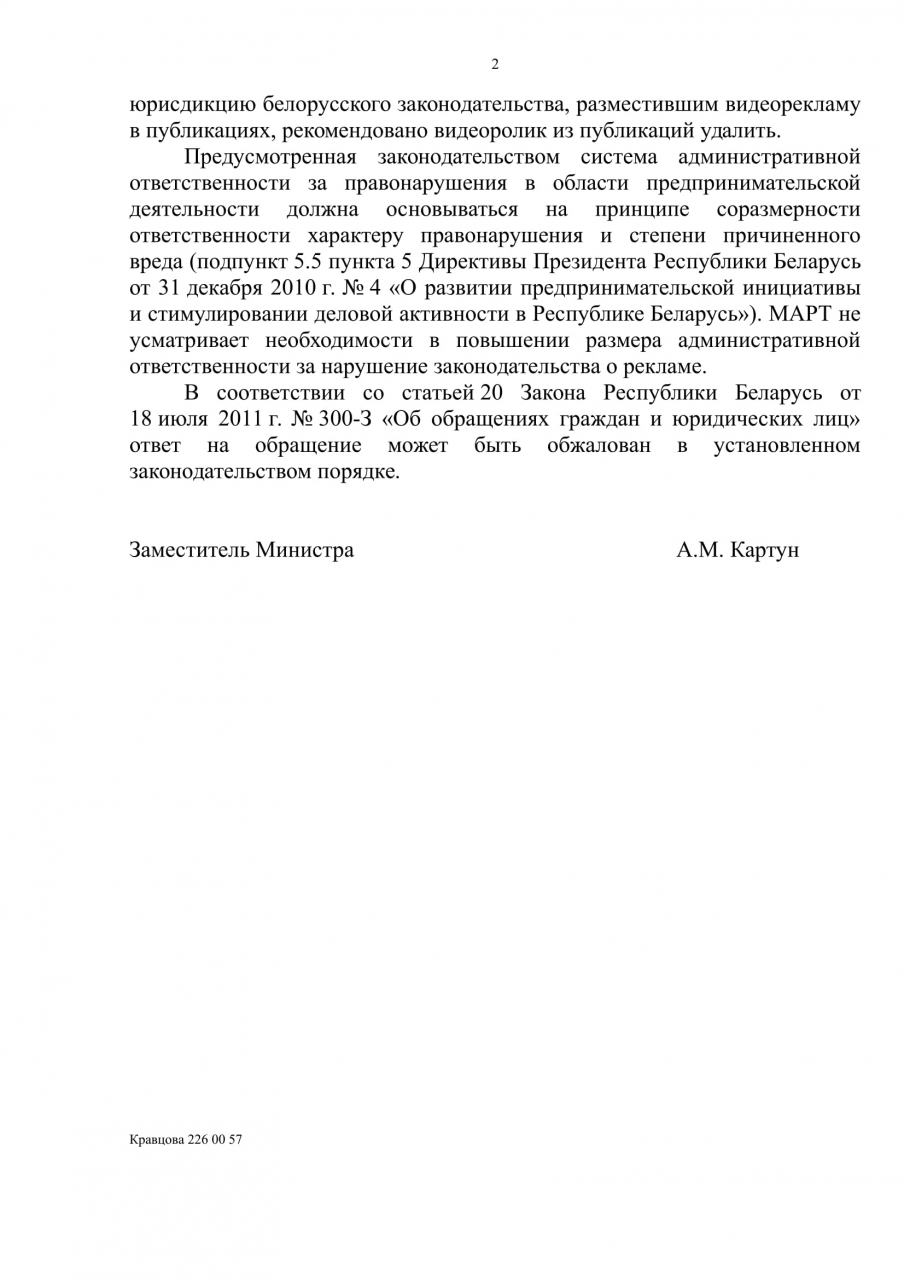 Таким образом, на основании ст. 8 Закона Республики Беларусь от 10 мая 2007 г. ”О рекламе“, согласно которой Министерство антимонопольного регулирования и торговли Республики Беларусь осуществляет контроль в области рекламной деятельности, а также ст. 26, устанавливающей, что неэтичной является реклама, которая содержит текстовую, зрительную и (или) звуковую информацию, нарушающую общепринятые нормы морали и нравственности, в том числе оскорбительные слова, сравнения, образы в отношении расы, национальности, внешнего вида, возрастной группы, пола, языка, профессии, социальной категории, религиозных, политических и иных убеждений граждан, и определяющей, что такая реклама является ненадлежащей,