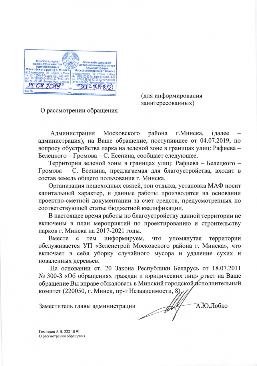 Учитывая вышеизложенное и на основании ст. 41 Закона «О местном управлении и самоуправлении», которая устанавливает, что исполкомы организуют работу по благоустройству территорий населенных пунктов, просим: обустроить на указанной территории парк, в том числе, поставить лавочки, и сделать всё необходимое для того, чтобы было комфортно отдыхать в данной зелёной зоне.