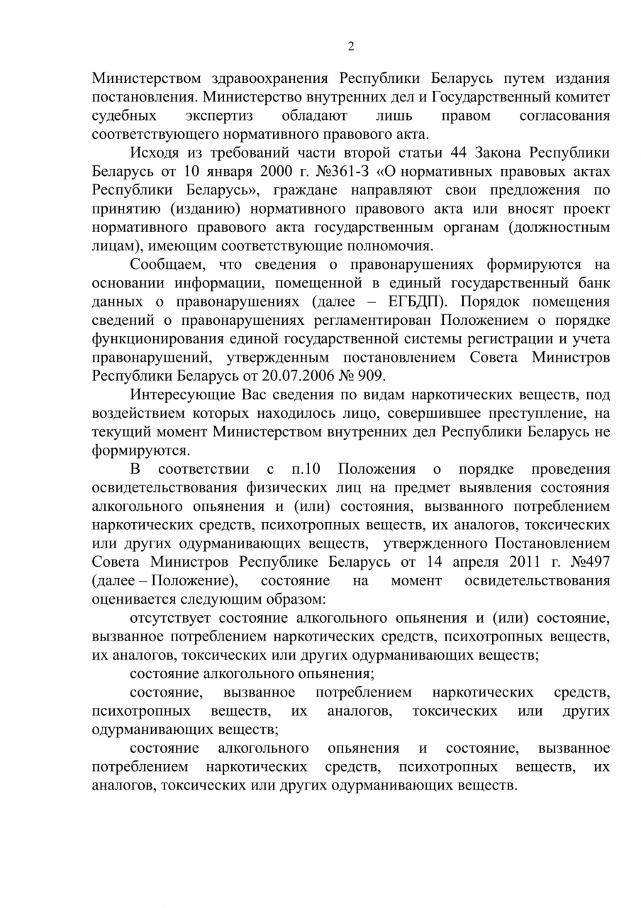 Любая часть растений рода Cannabis, независимо от количественного содержания в ней тетрагидроканнабинола и его массы, подлежит государственному контролю в Республике Беларусь. Сведения по видам наркотических веществ, под воздействием которых находилось лицо, совершившее преступление, на текущий момент Министерством внутренних дел Республики Беларусь не формируются. Отражение в документах по результатам освидетельствования вида потребленных наркотических средств, психотропных веществ или их аналогов законодательством не предписано.