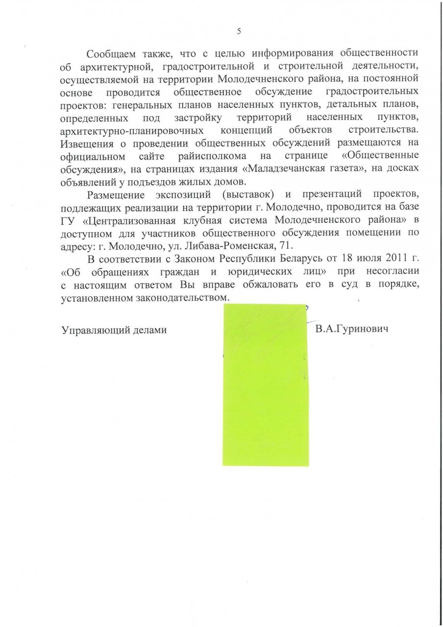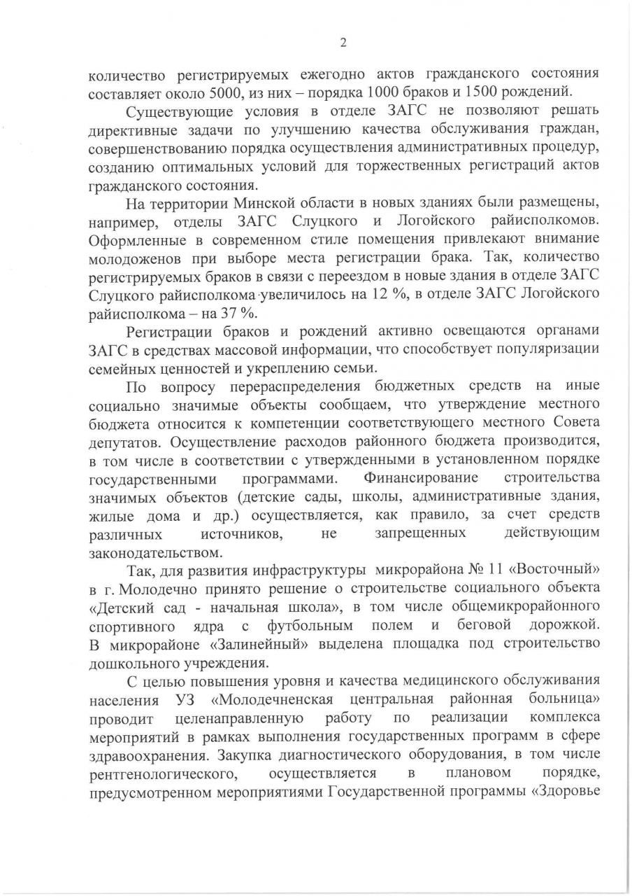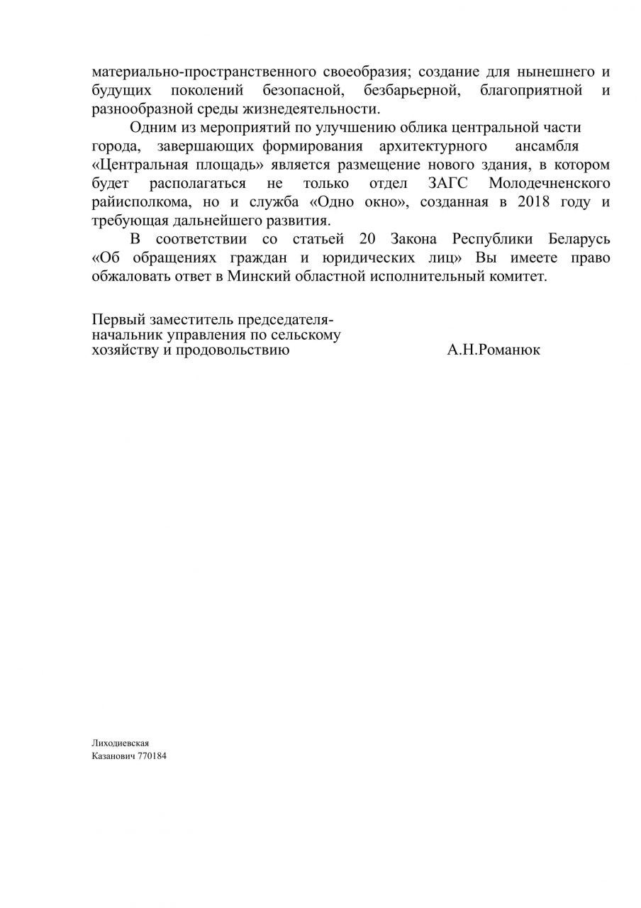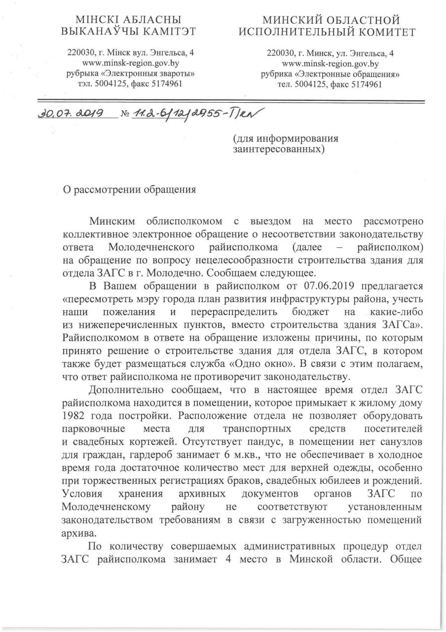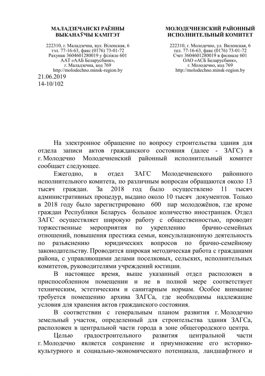 Жителей города не видят необходимости в строительстве нового здания ЗАГСа в Молодечно, нас волнует вопрос обеспечения безопасности, здоровья и образования жителей города (в частности, уровень оснащения медицинских учреждений, удобство и безопасность перемещения по дорогам города и количество учреждений образования), что и было указано в обращении. Однако в ответе Молодечненского райисполкома мы не получили обоснования того, почему приоритетные направления улучшения качества жизни граждан игнорируются, а финансирование направлено на усовершенствование здания ЗАГСа, которое граждане города посещают нерегулярно, в нем нет очередей за обращением, а также оно отлично выполняет свои функции в нынешнем виде. Мы хотим видеть реакцию властей на запросы и пожелания граждан, которые косвенно участвуют в финансировании этого строительство. Жители города не против нового здания ЗАГС, если наши первостепенные потребности удовлетворены.