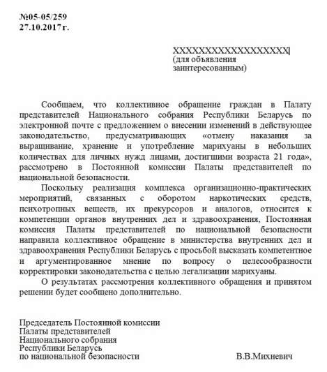 В свете актуальных для жизни страны событий (фактическая уголовная ответственность за употребление марихуаны и производных для несовершеннолетних), мы, граждане Республики Беларусь, хотим ознакомиться к компетентным мнением, упомянутым в ответе Палаты Представителей от 27.10.2017 №05-05/259 на электронное обращение, подписанное более чем 4000 заявителей за легализацию марихуаны.