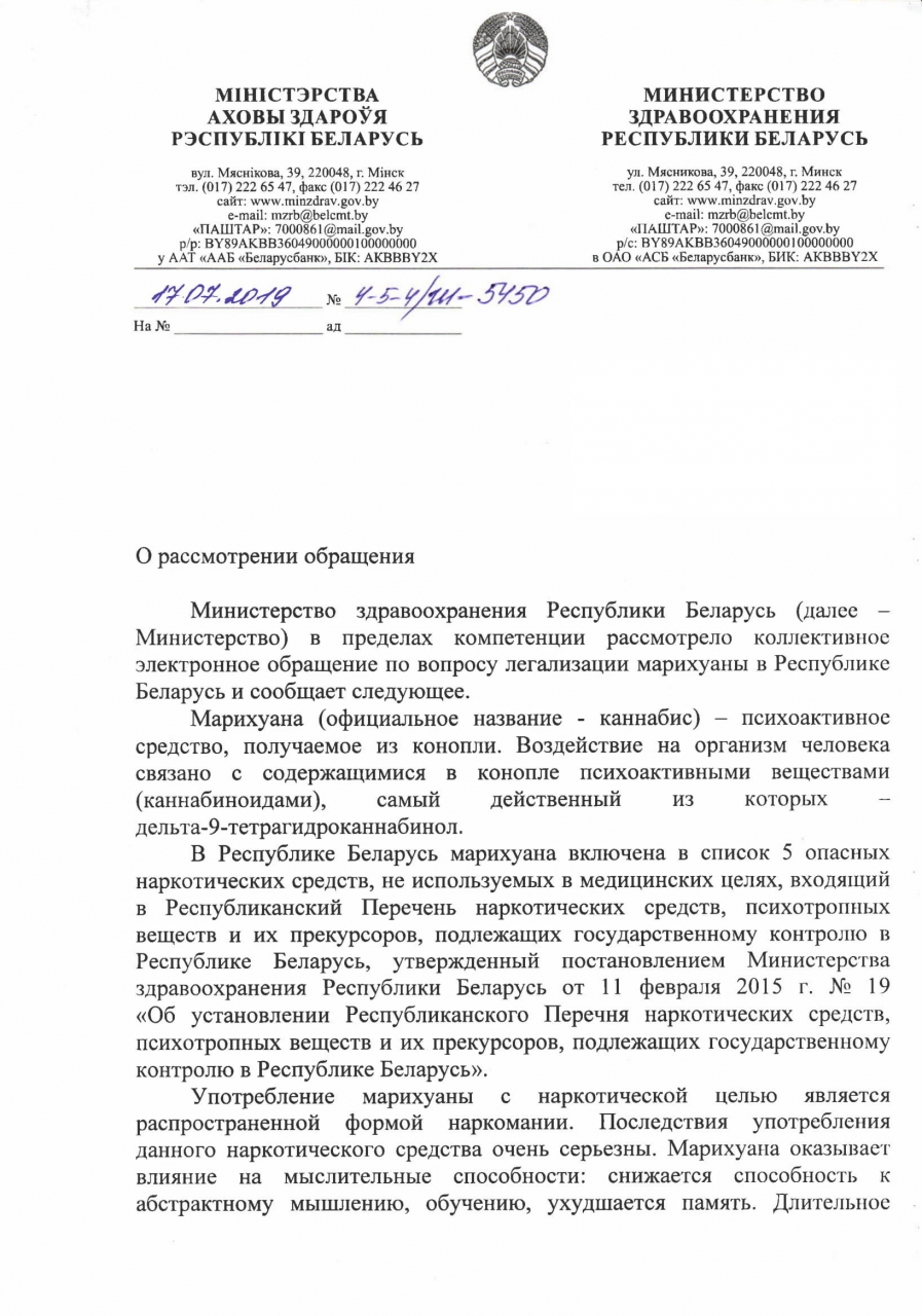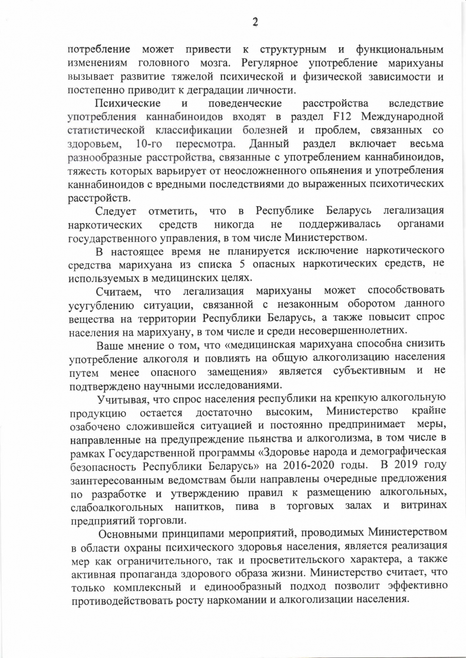 Мы, граждане Республики Беларусь, обеспокоены ситуацией с воздействием алкоголя на организм и сознание белорусских граждан и удивлены тем, что компетентное мнение Министерства здравоохранения расходится с мнением Всемирной Организацией Здравоохранения в отношении вреда каннабиса и производных, которая, конечно, разграничивает контролируемое употребление медицинского каннабиса и немедицинское употребление, однако признает его медицинскую пользу и эффективность его контролируемого применения.