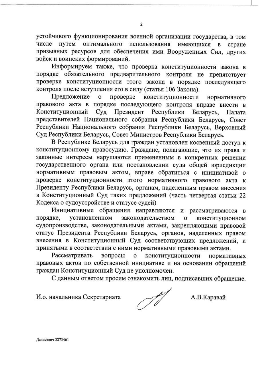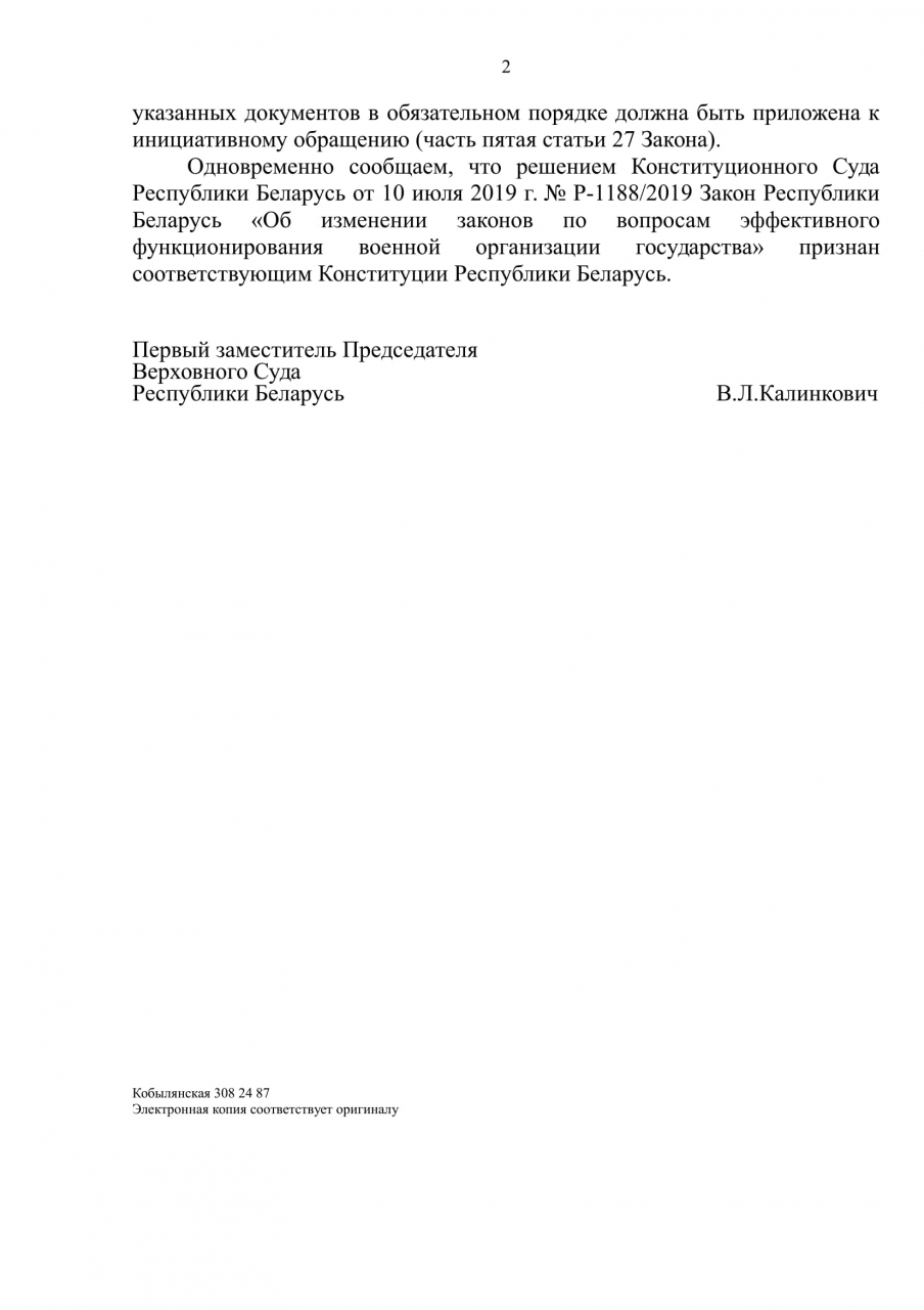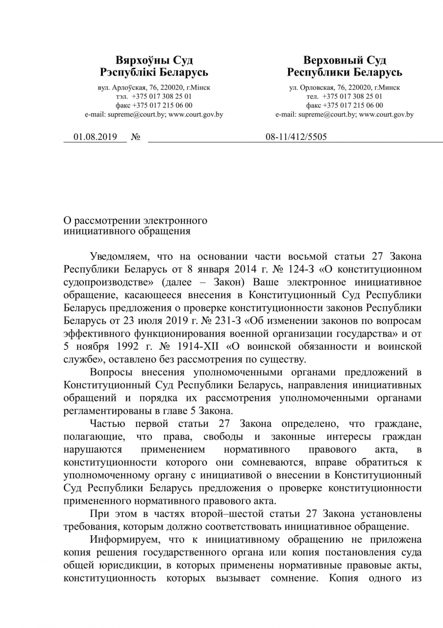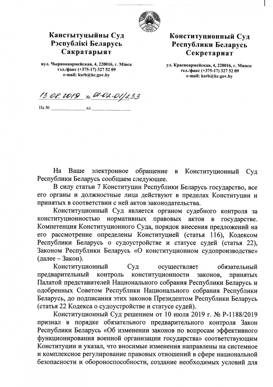 Обращение оставлено без рассмотрения по существу. Решением Конституционного Суда Республики Беларусь от 10 июля 2019г. № Р-1188/2019 Закон Республики Беларусь «Об изменении законов по вопросам эффективного функционирования военной организации государства» признан соответствующим Конституции Республики Беларусь.