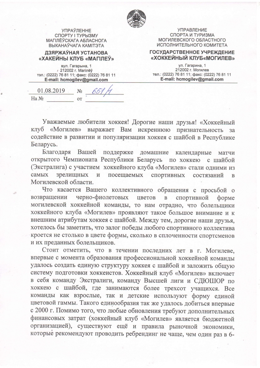 Мы, болельщики хоккейного клуба "Могилёв", просим вернуть чёрно-фиолетовые цвета нашей команде! Цвета имеют большое значение в жизни не только любого хоккейного клуба, но и его болельщиков.