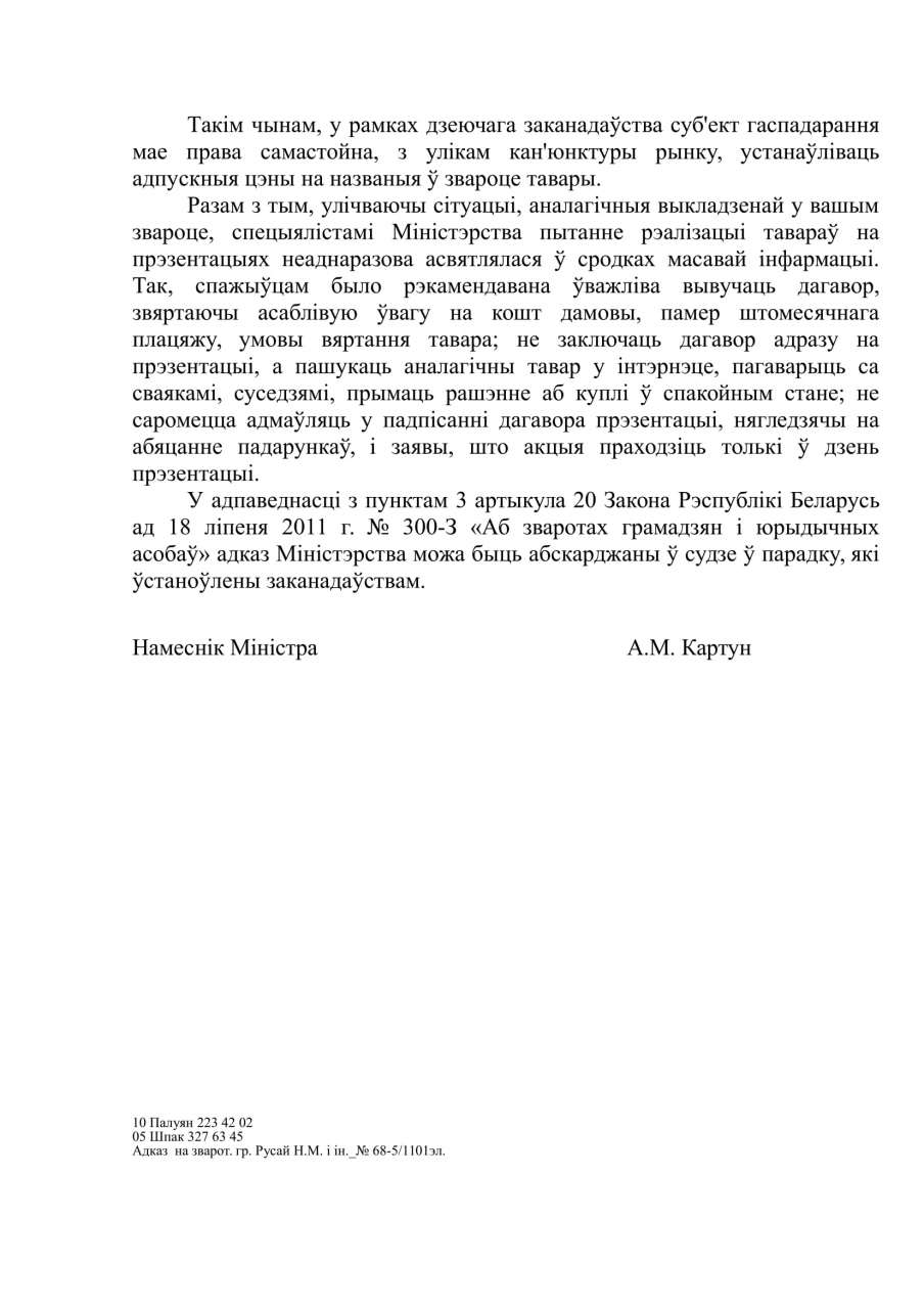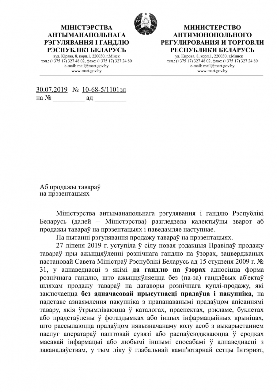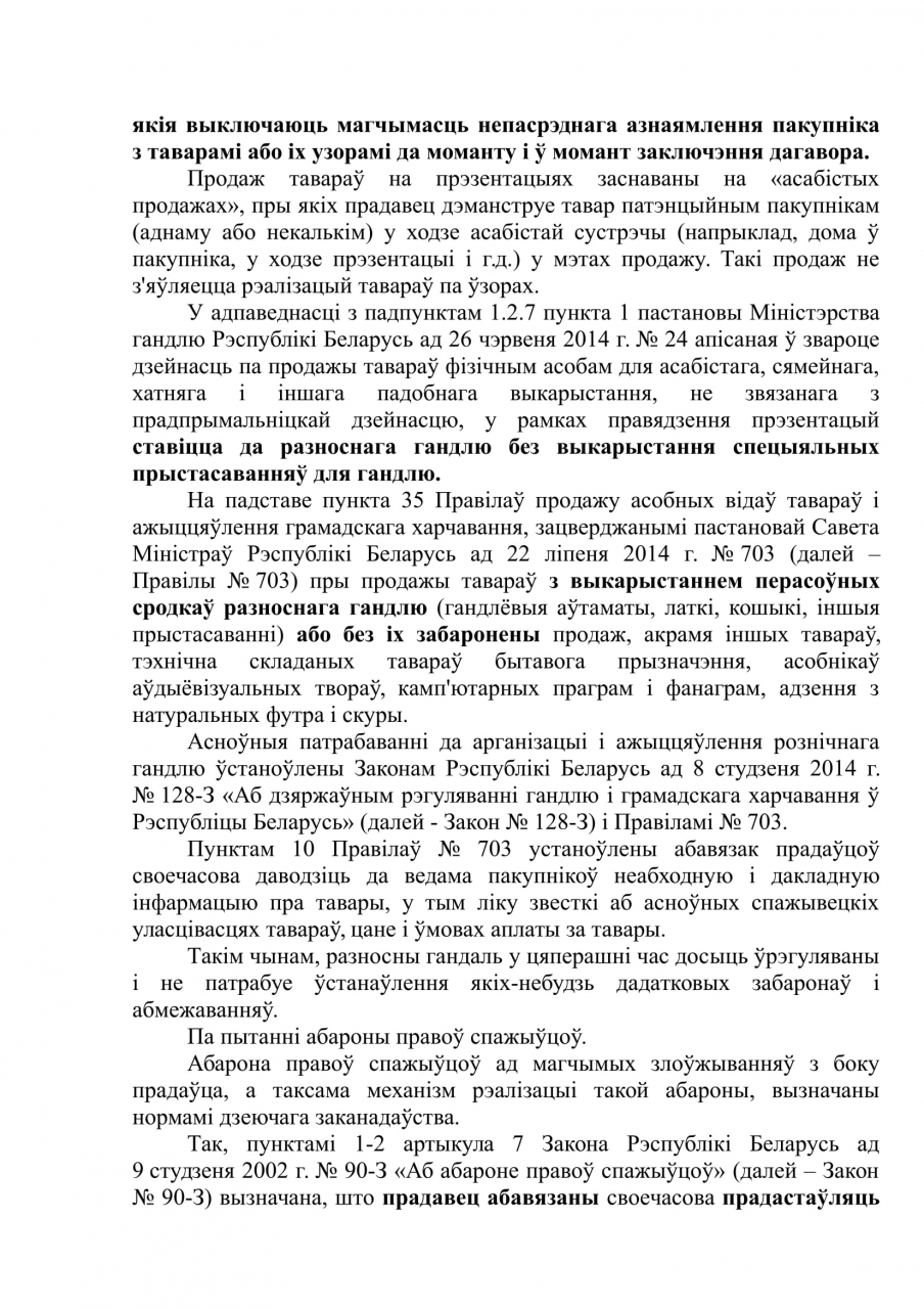 Зыходзячы са сказанага вышэй, з улікам таго, што ад дзеянняў агрэсіўнага маркетынгу звычайна церпяць уразлівыя слаі насельніцтва, патрабуем разгледзець на заканадаўчым узроўні пытанне па ўрэгуляванню гандлю на зазначаных прэзентацыях.