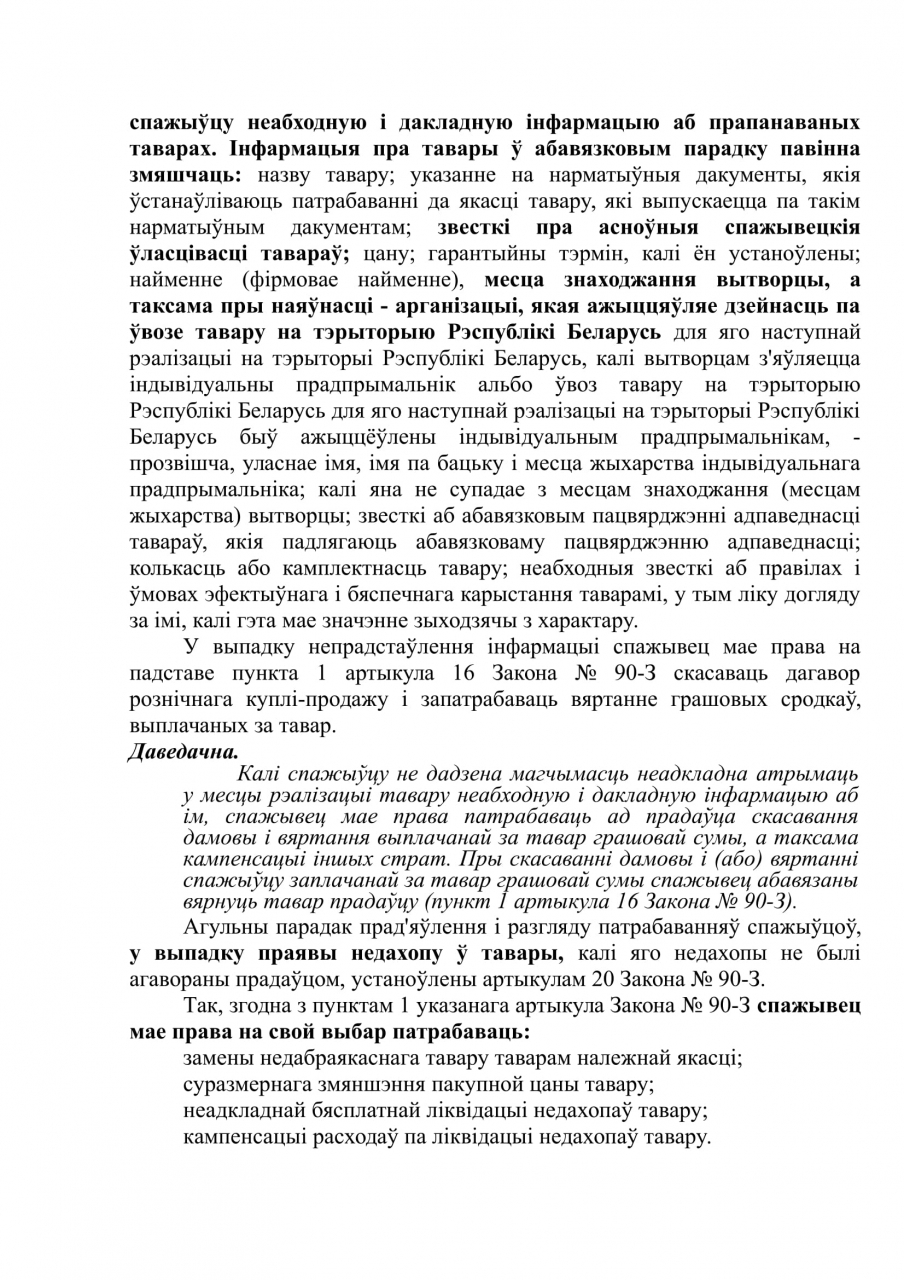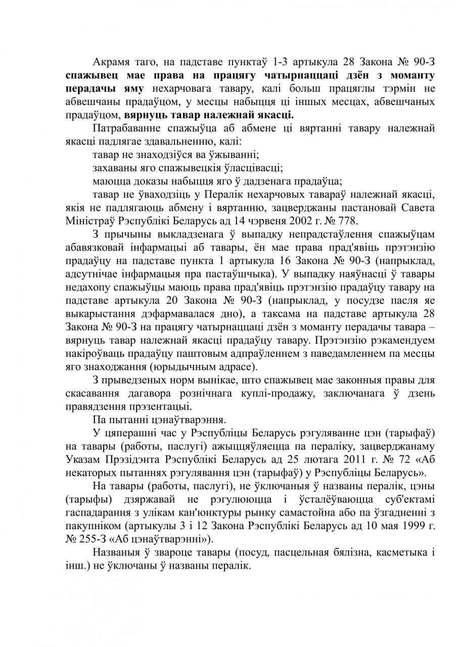 Cпажывец мае законныя правы для скасавання дагавора рознiчнага куплi-продажу, заключанага ў дзень правядзення прэзентацыі. Абарона правоў спажыўцоў ад магчымых злоўжыванняў з боку прадаўца, а таксама механізм рэалізацыі такой абароны, вызначаны нормамі дзеючага заканадаўства.