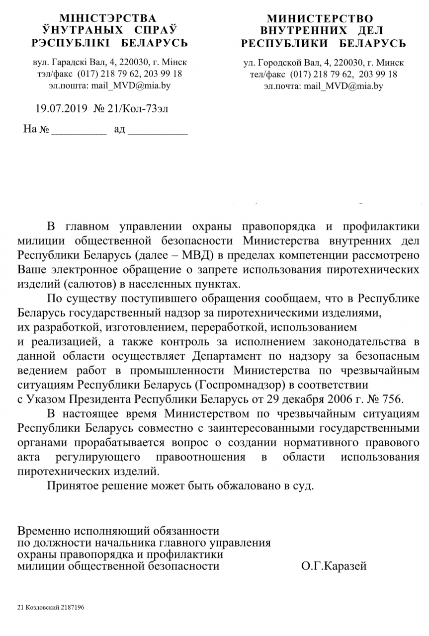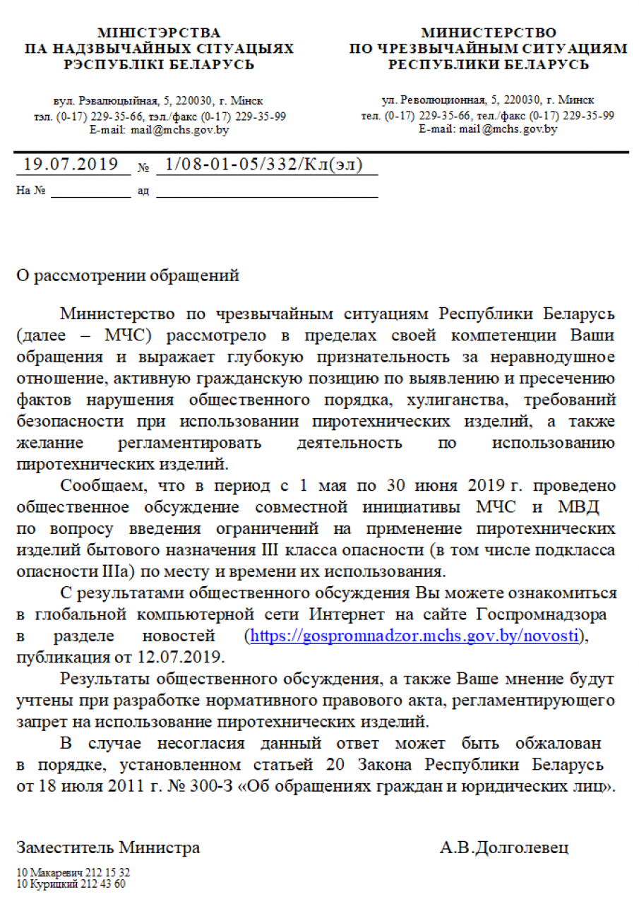 Министерством по чрезвычайным ситуациям Республики Беларусь совместно с заинтересованными государственными органами прорабатывается вопрос о создании нормативного правового акта регулирующего правоотношения в области использования пиротехнических изделий.