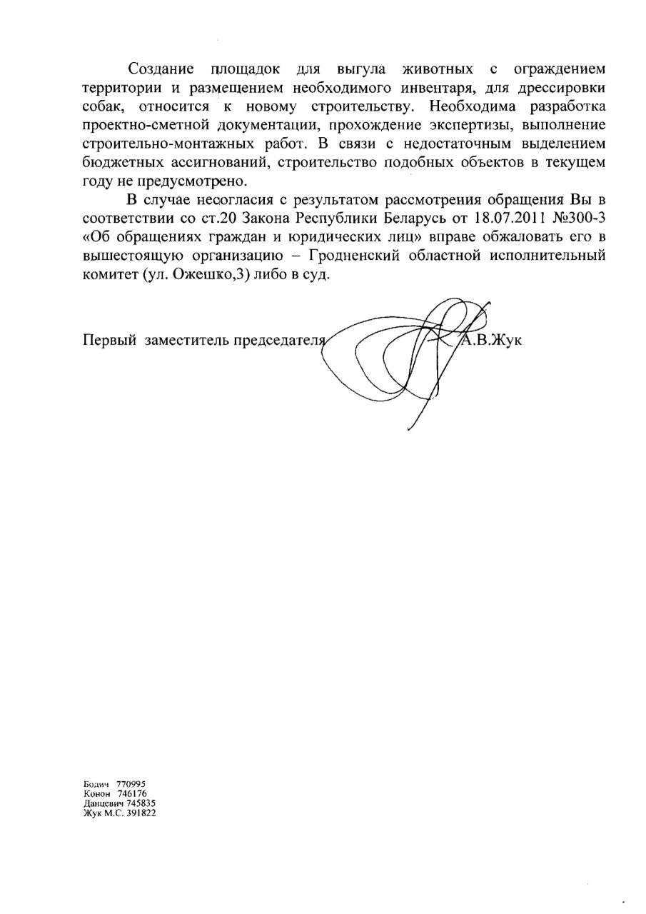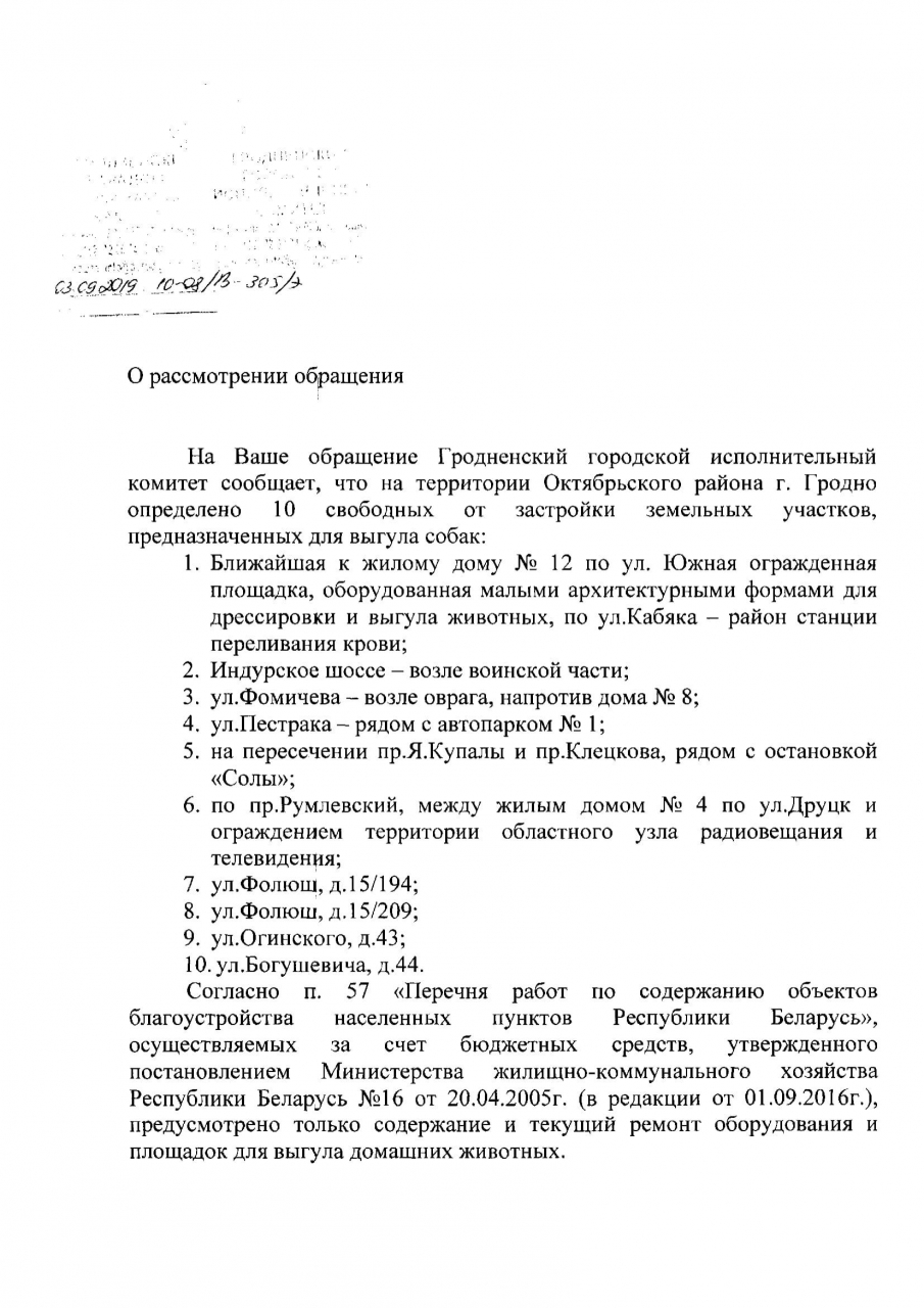 Мы, владельцы домашних животных города Гродно, а также иные неравнодушные граждане, руководствуясь ст.41 Закона "О местном управлении и самоуправлении в Республике Беларусь", которая предусматривает, что исполкомы организуют работу по благоустройству территорий населённых пунктов и решают вопросы размещения объектов на соответствующей территории, просим организовать место для выгула собак на пустыре возле перекрёстка ул.Южная и ул.Химиков, или в ближайшем возможном месте.