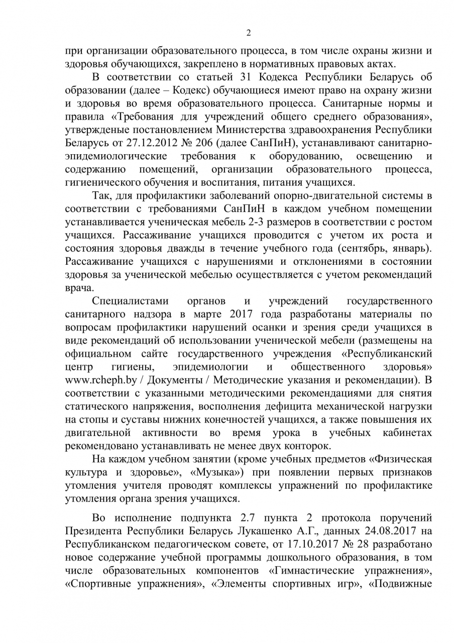 Просим предоставить информацию о результатах реализации инновационного проекта «Внедрение модели организации образовательного процесса на принципах эргономики», а также о том, какая работа ведётся по приобретению для учреждений общего среднего образования необходимой мебели и оборудования, и как решается проблема с оснащением каждого класса нашей страны конторками.