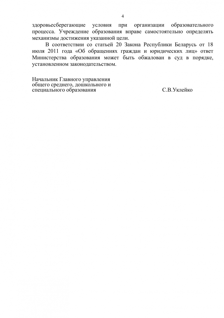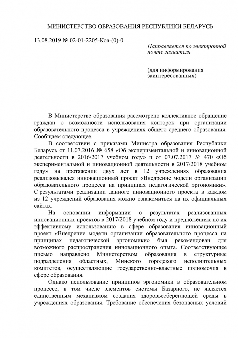 Как следует из полученного заявителями ответа №04-18/116Э от 27.04.2018 от заместителя председателя брестского облисполкома Величко О.И. данные просьбы выполнены не были. В ответе сообщалось, что в соответствии с приказом Министерства образования Республики Беларусь от 07.07.2017 № 470 «Об экспериментальной и инновационной деятельности в 2017/2018 году» в 12 учреждениях образования Республики Беларусь в 2016 — 2018 году реализовался инновационный проект «Внедрение модели организации образовательного процесса на принципах эргономики», которым предусмотрено использование системы Базарного В.Ф. при организации образовательного процесса. По итогам реализации данного проекта должно было быть принято решение о возможности его внедрения в образовательный процесс учреждений образования Республики Беларусь.